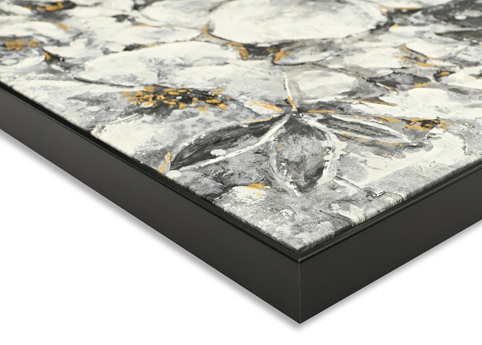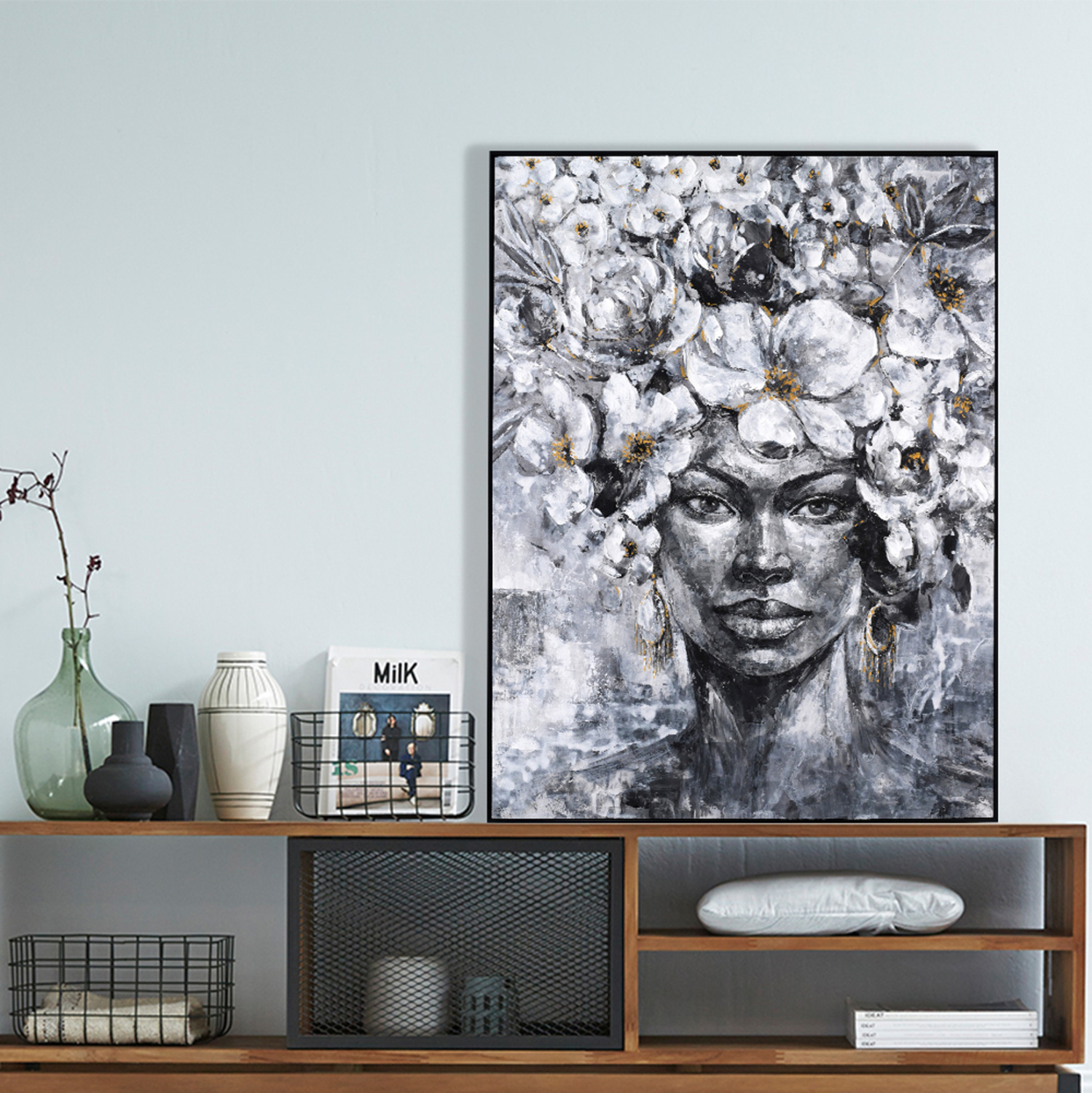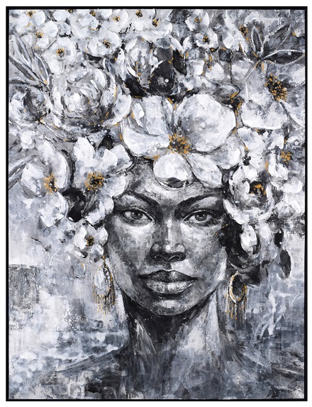 Αυτός ο πίνακας απεικονίζει το πρόσωπο μιας γυναίκας και είναι ζωγραφισμένος κατά 80% με το χέρι σε καμβά με εκτύπωση. Η κορνίζα είναι μαύρη από πολυστυρένο (είδος πλαστικού άκαμπτο και συμπαγές).