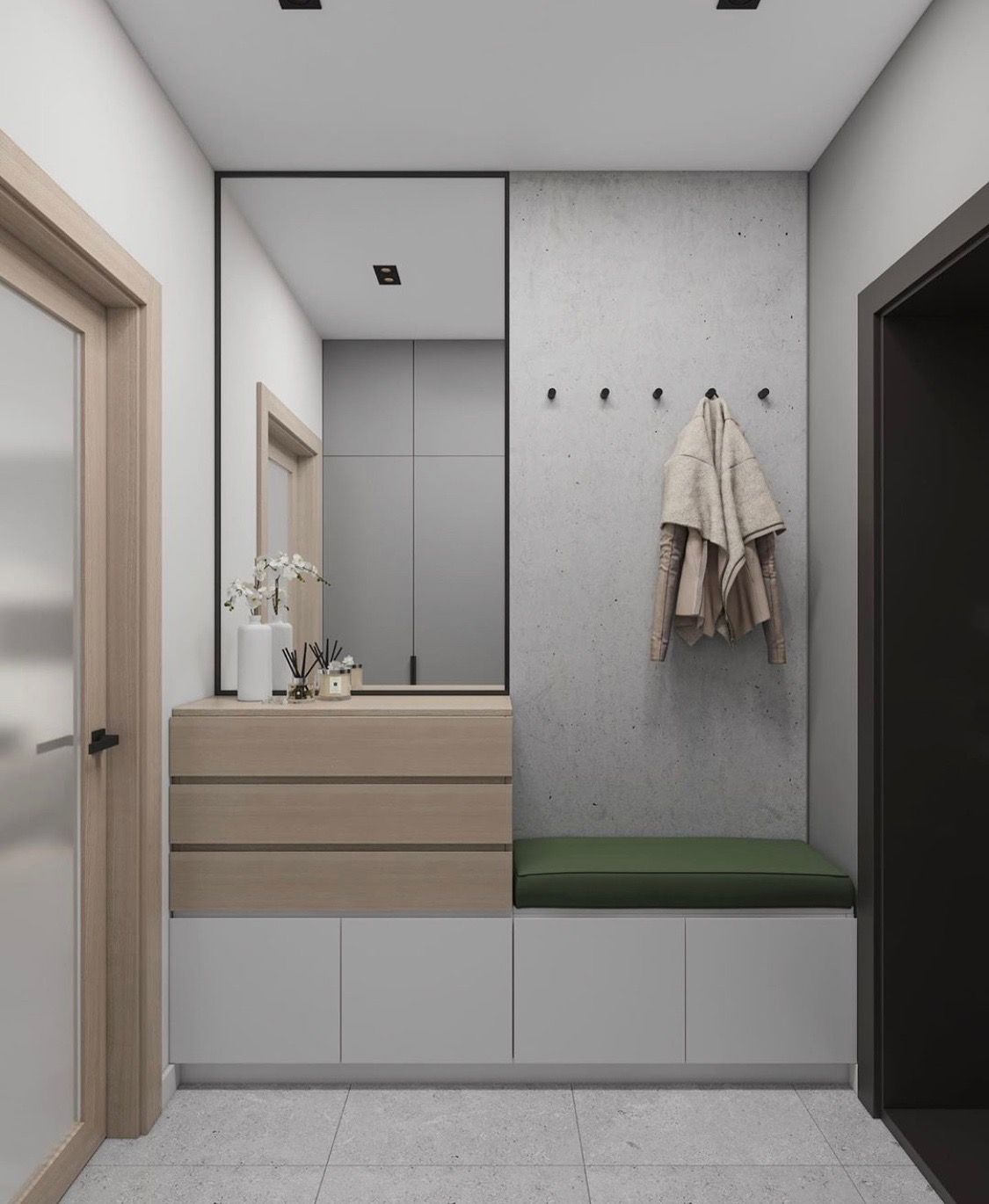 Ο μεγάλος επιτοίχιος καθρέφτης ενισχύει την αίσθηση του χώρου και του φωτός, ενώ η επιτοίχια κρεμάστρα εξυπηρετεί άμεσα την καθημερινή χρήση. Οι καθαρές γραμμές, οι φυσικές υφές και οι μοντέρνοι συνδυασμοί υλικών δημιουργούν ένα διαχρονικό αποτέλεσμα που αναβαθμίζει την είσοδο του σπιτιού σας.