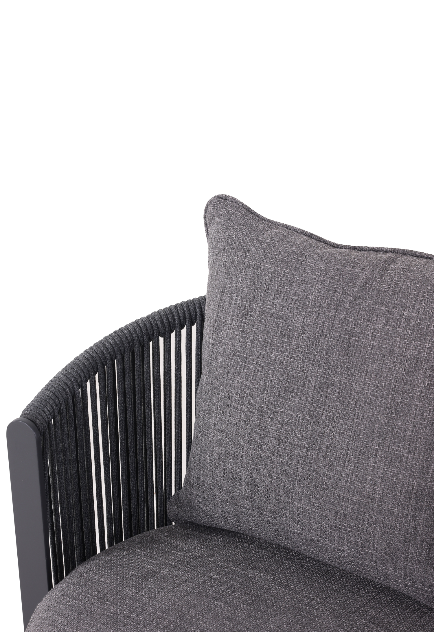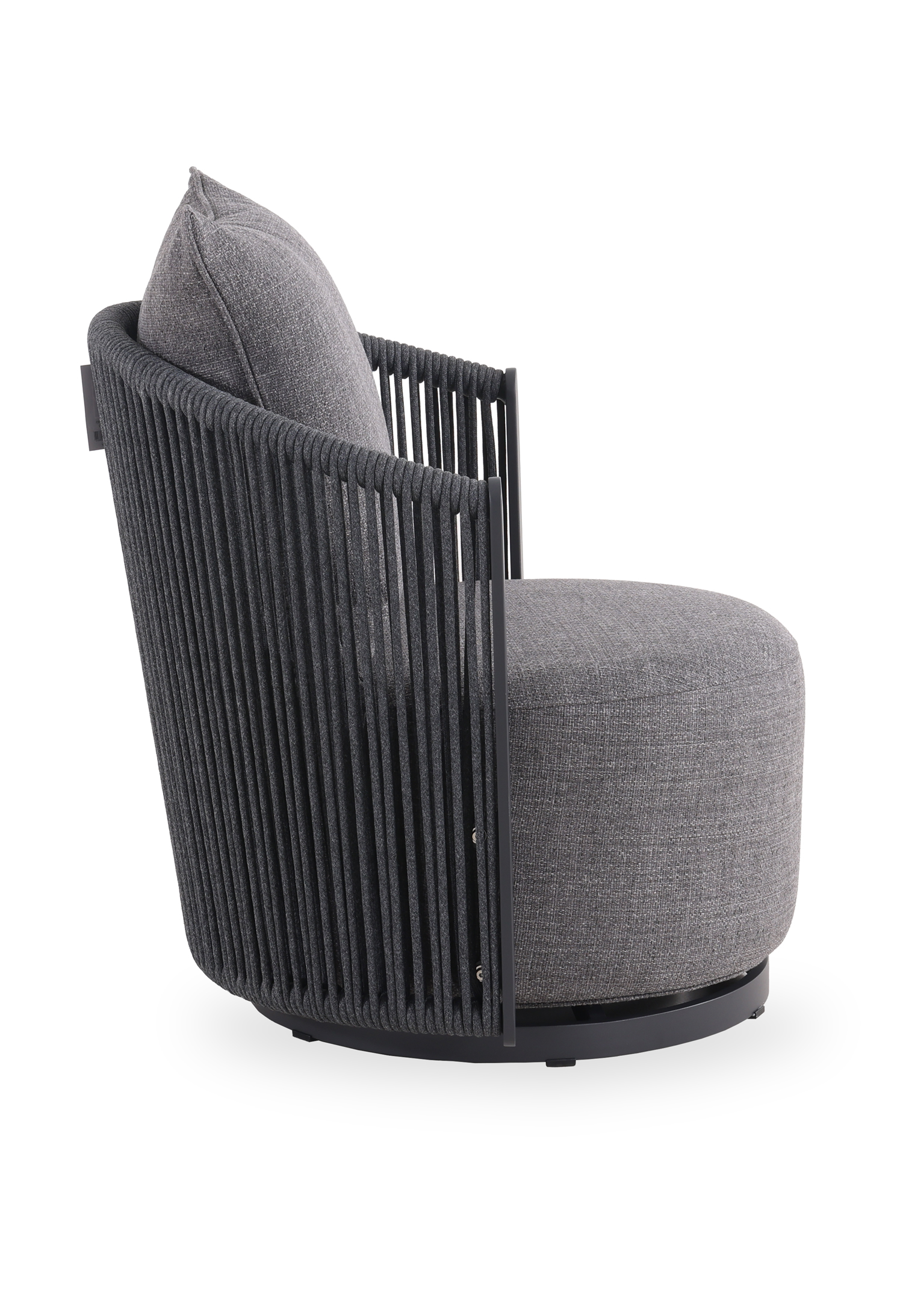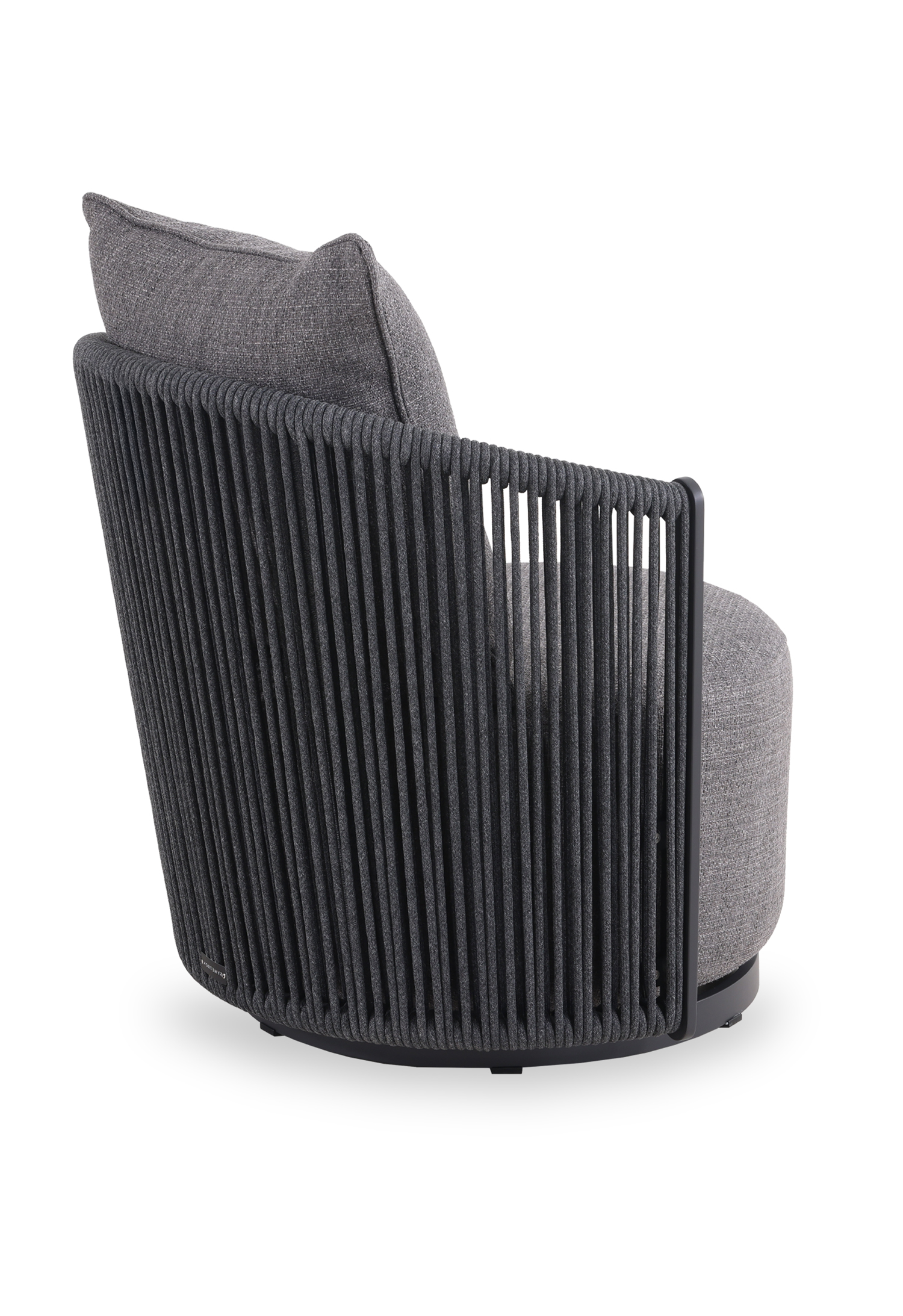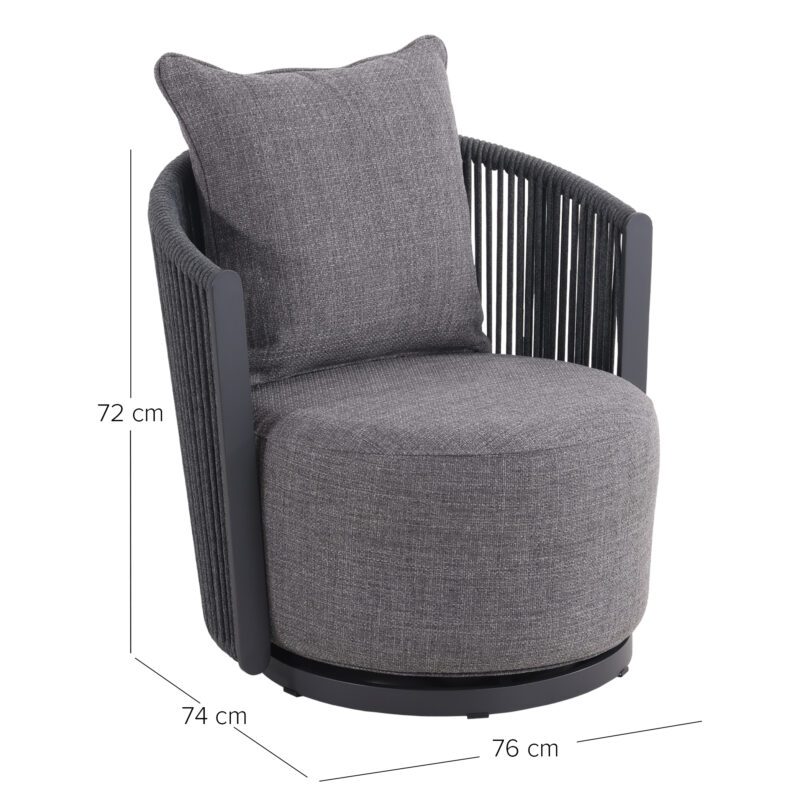 Το σχεδόν κυκλικό design, τα εξαιρετικά υλικά κατασκευής και το τέλειο φινίρισμα σε κάθε λεπτομέρεια, αποδεικνύουν για άλλη μια φορά την αφοσίωση της εταιρίας μας στην προσφορά ποιότητας στον τομέα του επίπλου! Η πολυθρόνα είναι κατασκευασμένη από αλουμίνιο και σχοινί σε ΑΝΘΡΑΚΙ χρώμα και αφαιρούμενα καλύμματα μαξιλαριών (με γέμιση τυπικού αφρού) σε λίγο πιο ανοιχτό χρώμα. Κατασκευάζεται, επίσης, σε χρώμα IVORY (σαν κρεμ), σχοινί και αφαιρούμενα καλύμματα μαξιλαριών (με γέμιση τυπικού αφρού) σε κυρίαρχο ΜΠΕΖ χρώμα. Φέρτε την απόλυτη άνεση στον εξωτερικό σας χώρο με στυλ! Πέρα από τακτικό ξεσκόνισμα, μπορείτε να χρησιμοποιείτε ένα υγρό πανί. Μην χρησιμοποιείτε χημικά καθαριστικά.