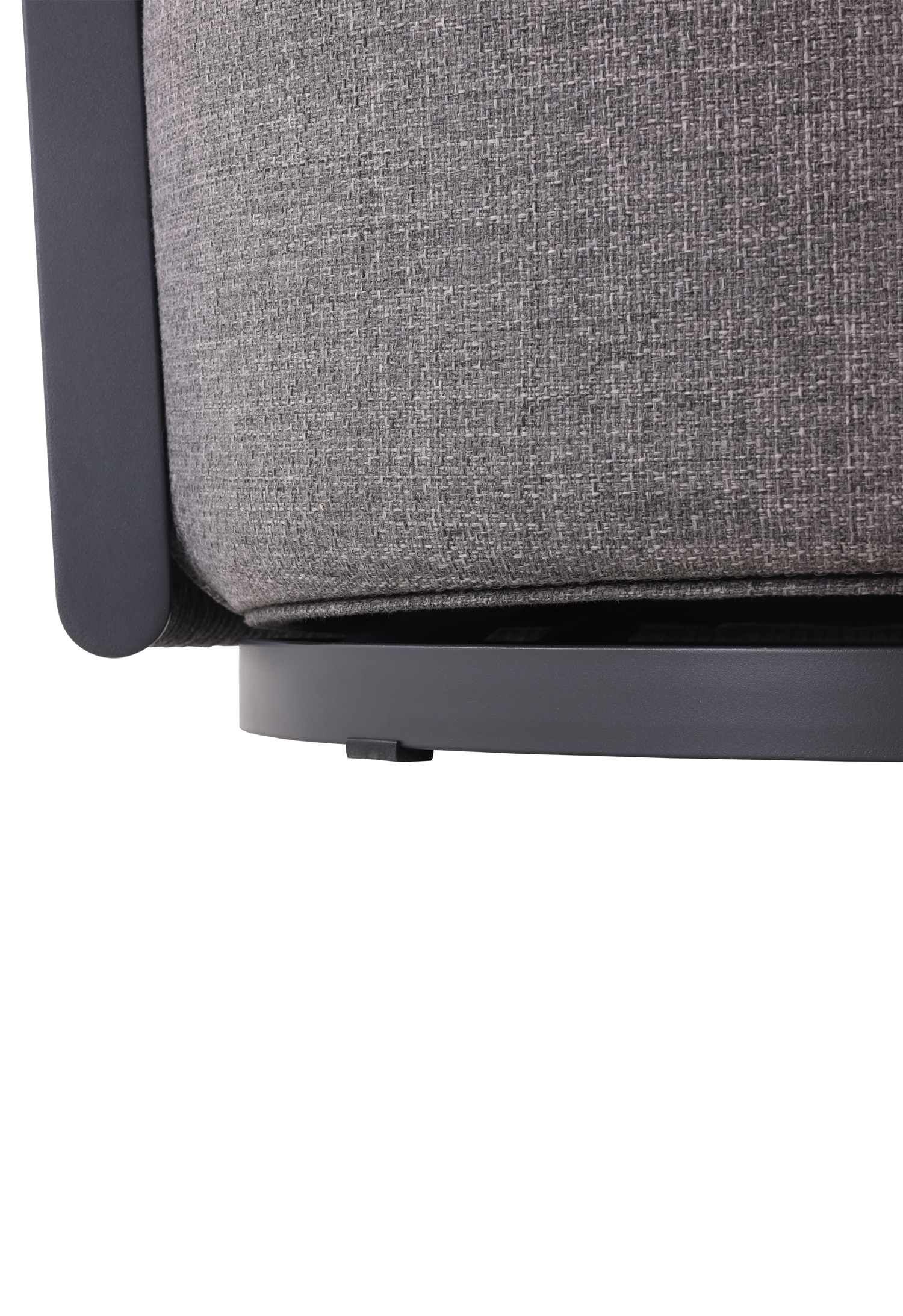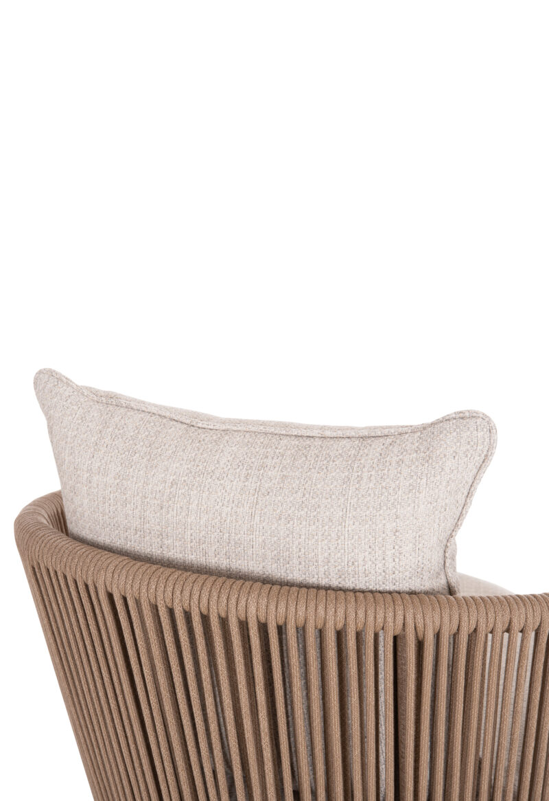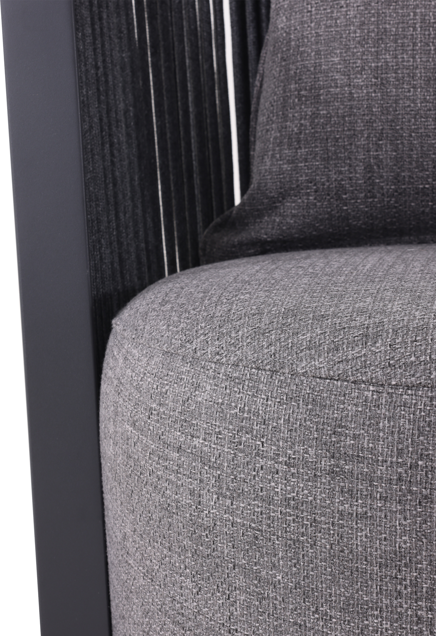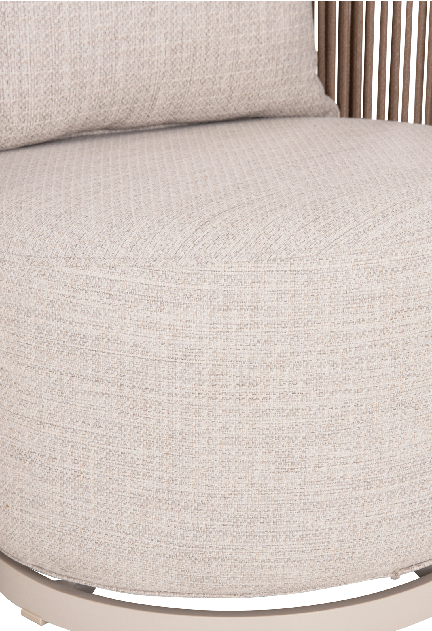 Το σχεδόν κυκλικό design, τα εξαιρετικά υλικά κατασκευής και το τέλειο φινίρισμα σε κάθε λεπτομέρεια, αποδεικνύουν για άλλη μια φορά την αφοσίωση της εταιρίας μας στην προσφορά ποιότητας στον τομέα του επίπλου! Η πολυθρόνα είναι κατασκευασμένη από αλουμίνιο και σχοινί σε ΑΝΘΡΑΚΙ χρώμα και αφαιρούμενα καλύμματα μαξιλαριών (με γέμιση τυπικού αφρού) σε λίγο πιο ανοιχτό χρώμα. Κατασκευάζεται, επίσης, σε χρώμα IVORY (σαν κρεμ), σχοινί και αφαιρούμενα καλύμματα μαξιλαριών (με γέμιση τυπικού αφρού) σε κυρίαρχο ΜΠΕΖ χρώμα. Φέρτε την απόλυτη άνεση στον εξωτερικό σας χώρο με στυλ! Πέρα από τακτικό ξεσκόνισμα, μπορείτε να χρησιμοποιείτε ένα υγρό πανί. Μην χρησιμοποιείτε χημικά καθαριστικά.