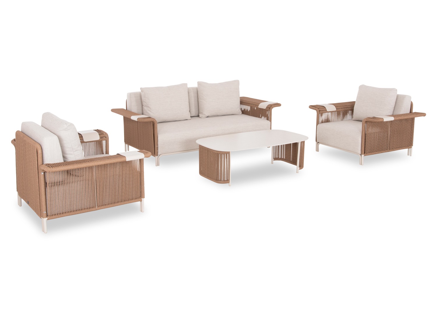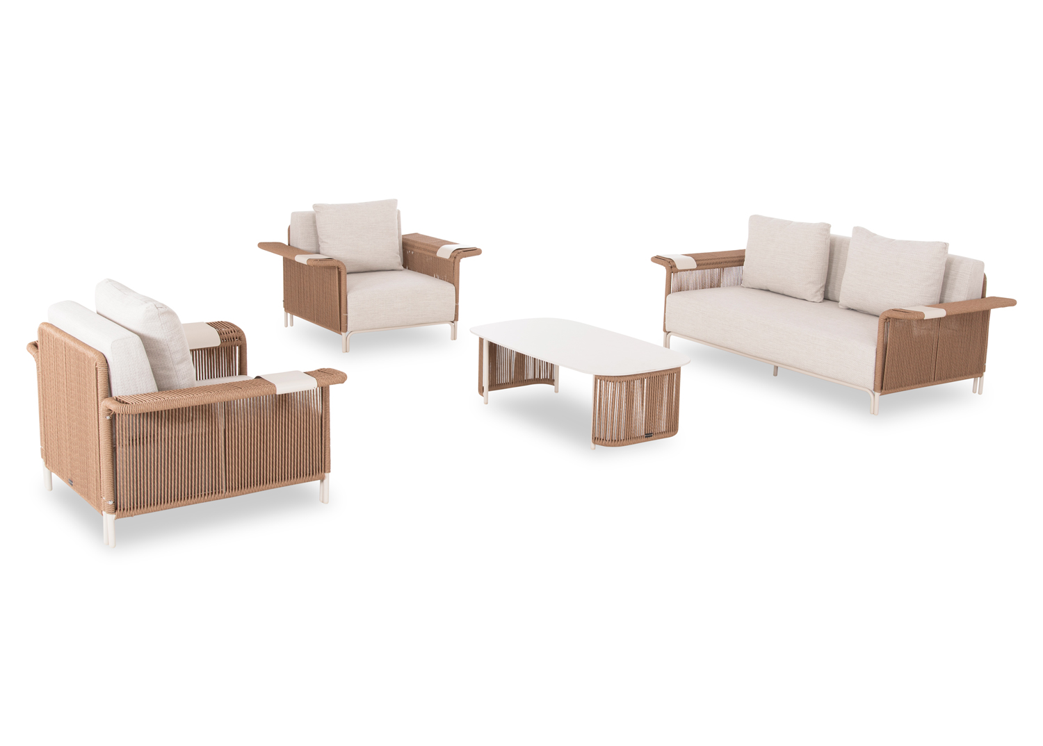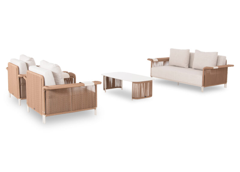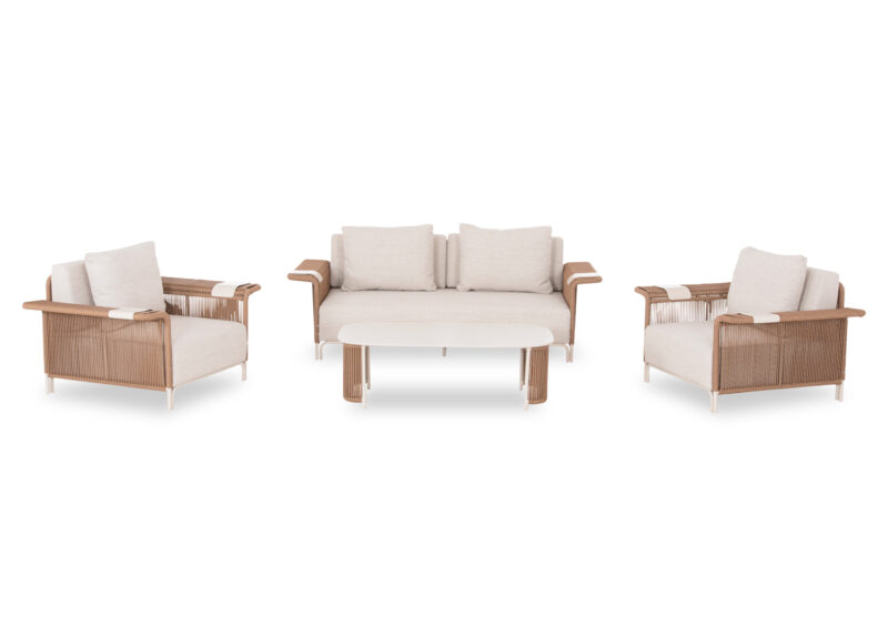 Σας παρουσιάζουμε ένα ακόμα σετ σαλόνι 4τμχ εξωτερικού χώρου της σειράς AURORA. Μια σειρά που, μαζί με άλλες, ανεβάζει τον πήχη της ποιότητας και της αισθητικής που προσφέρουμε σε εσάς, τόσο για το σπίτι, όσο και για κάθε ανάλογο επαγγελματικό χώρο! Με απαράμιλλη ποιότητα κατασκευής και υλικών, θα αναβαθμίσει την εικόνα σε όποιο χώρο επιθυμείτε. Αποτελείται από 2-θέσιο καναπέ και 2 αναπαυτικότατες lounge πολυθρόνες με φαρδιά μπράτσα αλουμινίου, και 1 τραπεζάκι, όλα με παρόμοια αισθητική. Ο σκελετός είναι από αλουμίνιο σε ΚΡΕΜ (ivory) χρώμα με μαξιλάρια (με γέμιση τυπικού αφρού) σε ΜΠΕΖ χρώμα. Η επένδυση έχει γίνει με P.Ε. wicker που είναι άλλη μία πινελιά πολυτέλειας σε όλο το σετ, ενώ το top στο τραπεζάκι από sintered stone σε ακόμα πιο ανοιχτόχρωμη απόχρωση (Urano Ivory) απογειώνει ποιοτικά όλη την σύνθεση! Πέρα από τακτικό ξεσκόνισμα, μπορείτε να χρησιμοποιείτε ένα υγρό πανί. Μην χρησιμοποιείτε χημικά καθαριστικά. Μην χρησιμοποιείτε σκληρές βούρτσες ή πιεστικά μηχανήματα πλύσης.