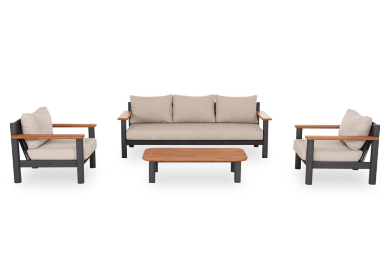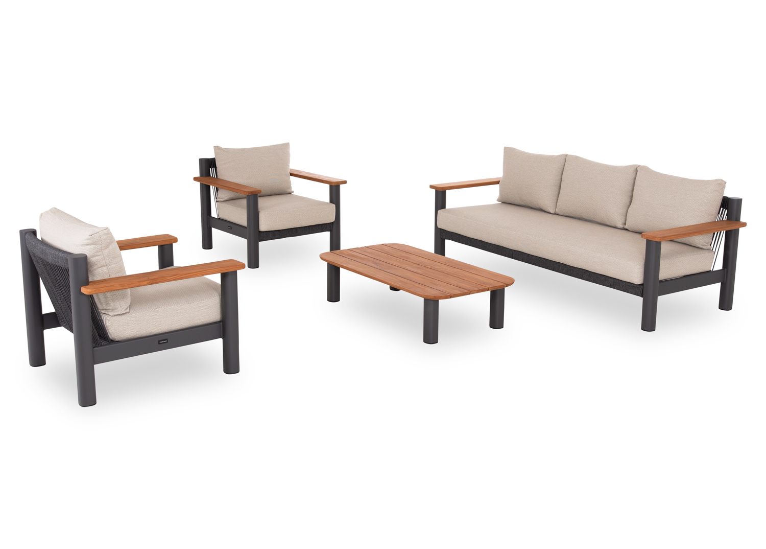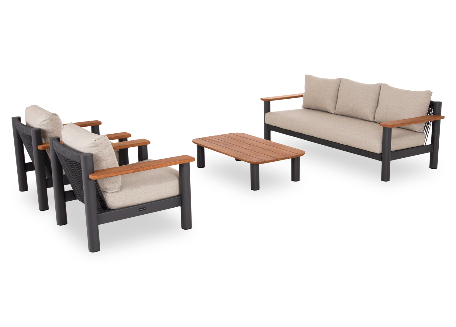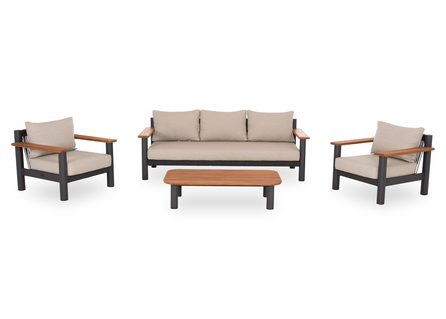 Αποτελείται από έναν τριθέσιο καναπέ, δύο αναπαυτικές πολυθρόνες, κι ένα ορθογώνιο τραπεζάκι. Το τραπεζάκι έχει επιφάνεια από ποιοτικό ξύλο Teak, όπως και η επένδυση των μπράτσων στον καναπέ και στις πολυθρόνες. Όλο το σετ είναι κατασκευασμένο από αλουμίνιο σε ΑΝΘΡΑΚΙ ή ΜΠΕΖ χρώμα, με πλάτη από σχοινί σε πιο ανοιχτό γκρι χρώμα και μαξιλάρια από OLEFIN ύφασμα σε ΜΠΕΖ χρώμα. Πέρα από τακτικό ξεσκόνισμα, μπορείτε να χρησιμοποιείτε ένα υγρό πανί. Μην χρησιμοποιείτε χημικά καθαριστικά.