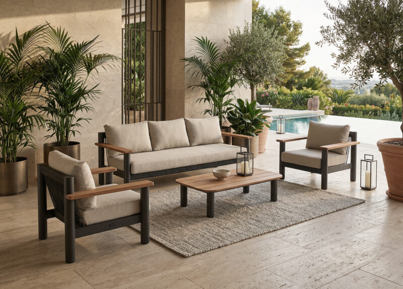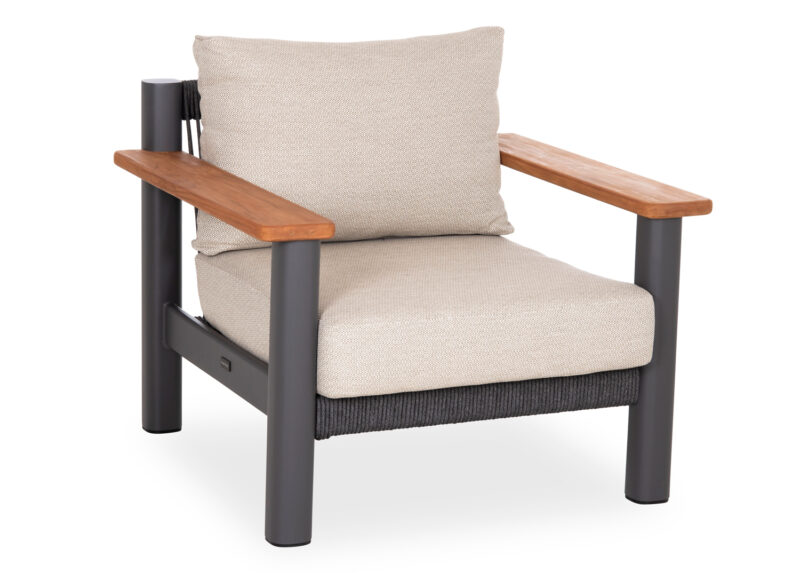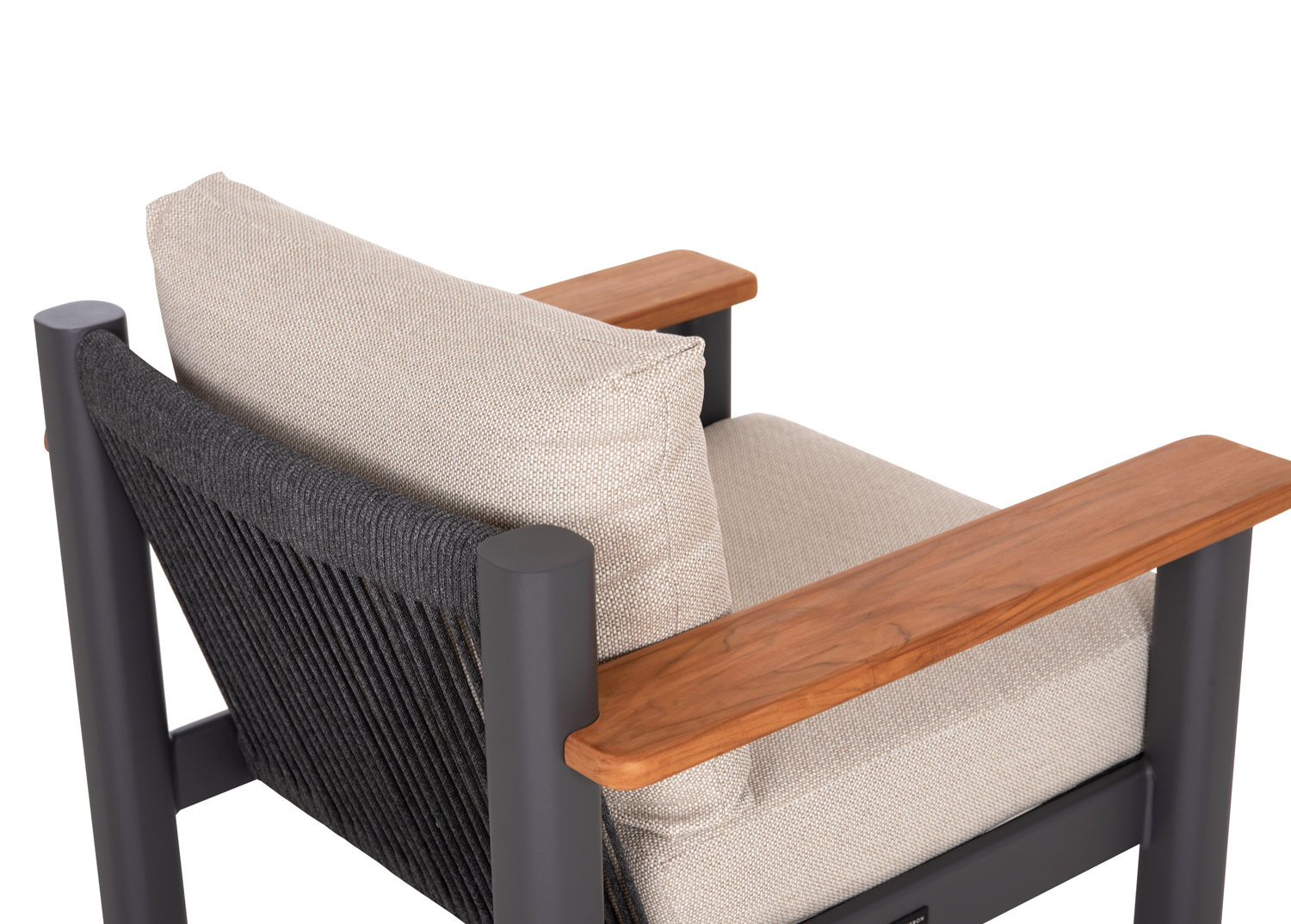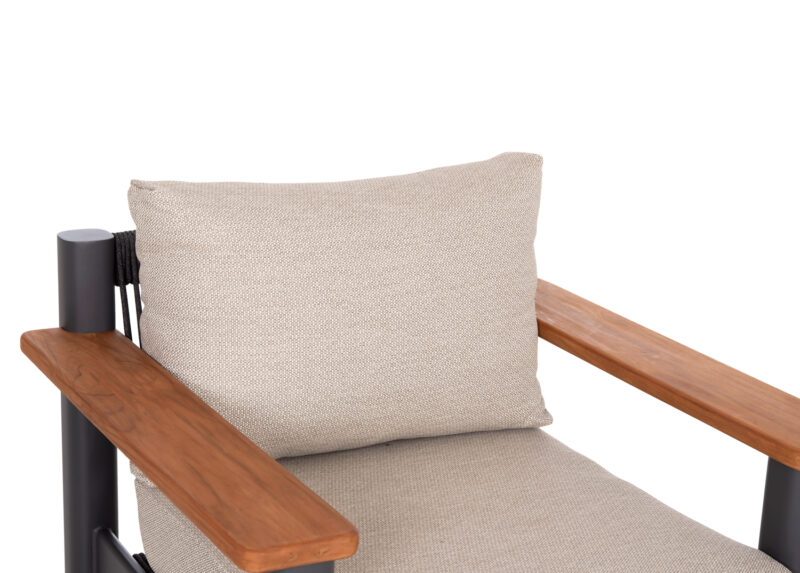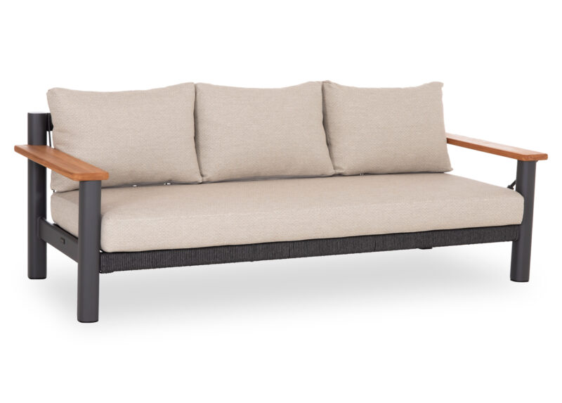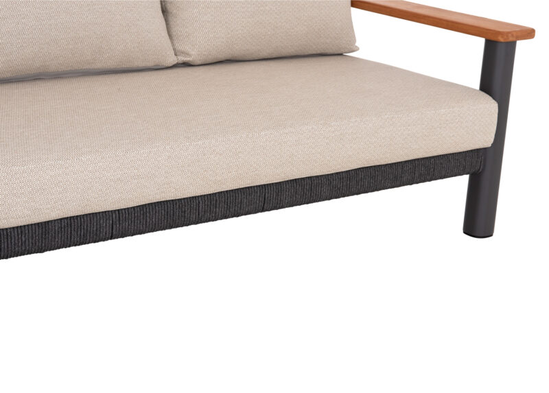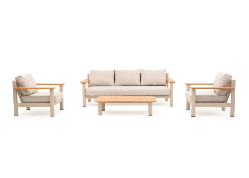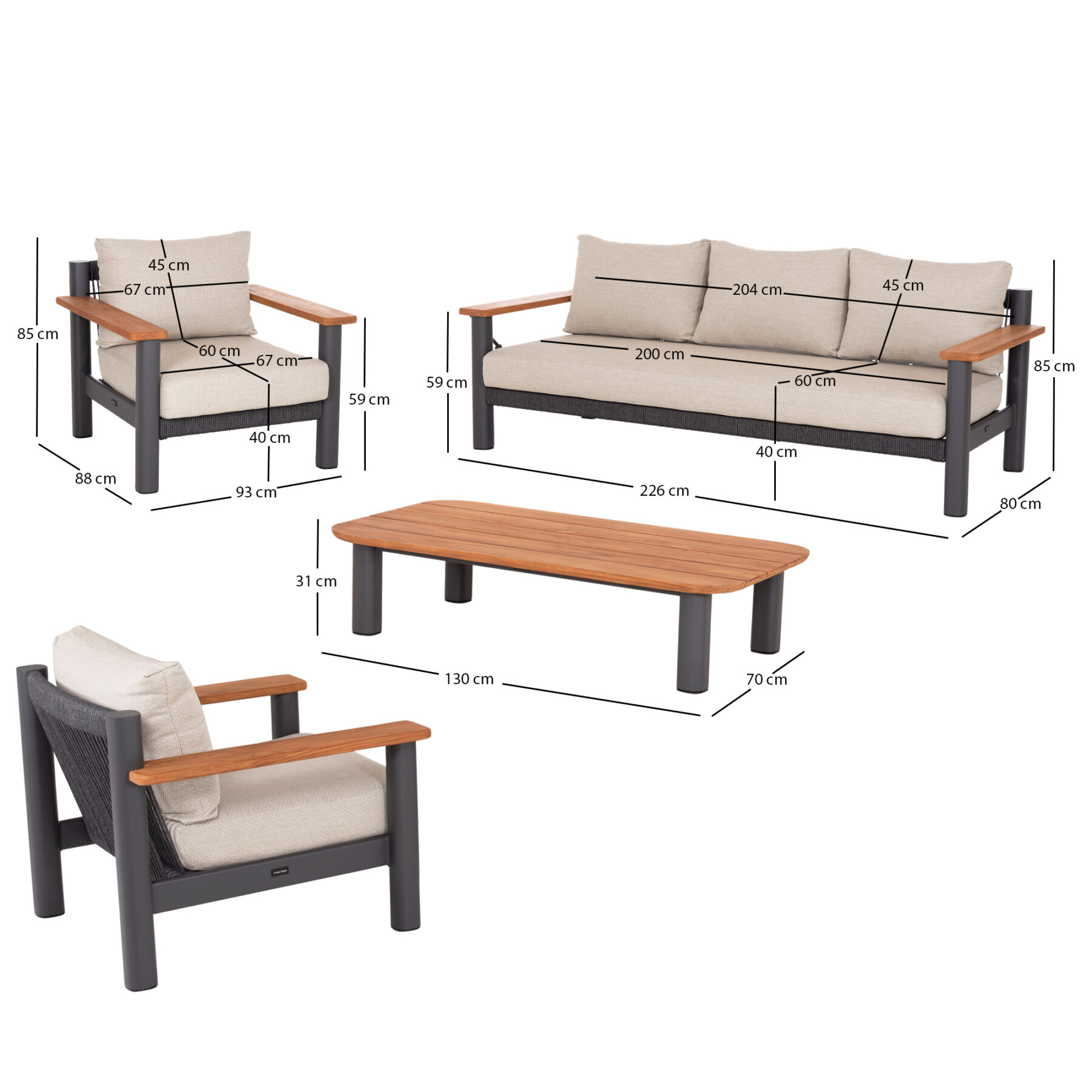 Αποτελείται από έναν τριθέσιο καναπέ, δύο αναπαυτικές πολυθρόνες, κι ένα ορθογώνιο τραπεζάκι. Το τραπεζάκι έχει επιφάνεια από ποιοτικό ξύλο Teak, όπως και η επένδυση των μπράτσων στον καναπέ και στις πολυθρόνες. Όλο το σετ είναι κατασκευασμένο από αλουμίνιο σε ΑΝΘΡΑΚΙ ή ΜΠΕΖ χρώμα, με πλάτη από σχοινί σε πιο ανοιχτό γκρι χρώμα και μαξιλάρια από OLEFIN ύφασμα σε ΜΠΕΖ χρώμα. Πέρα από τακτικό ξεσκόνισμα, μπορείτε να χρησιμοποιείτε ένα υγρό πανί. Μην χρησιμοποιείτε χημικά καθαριστικά.