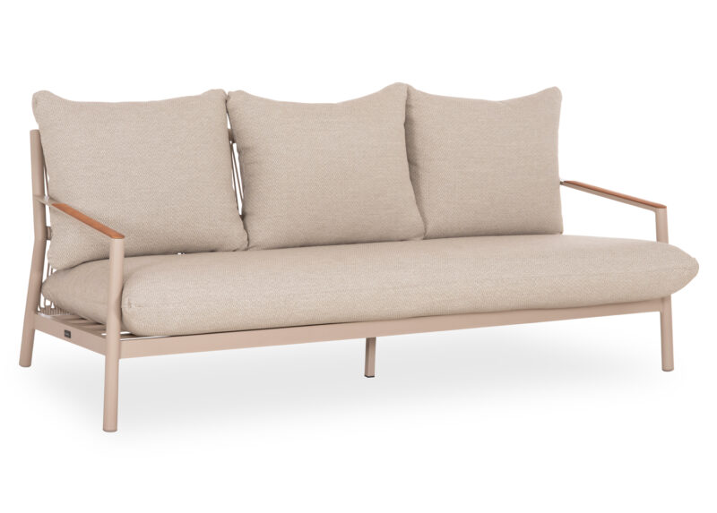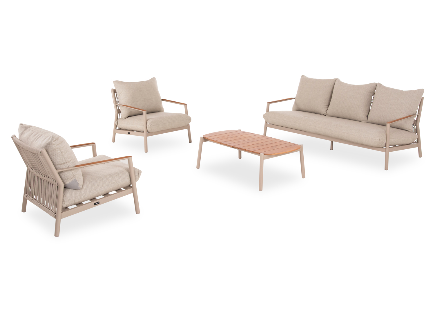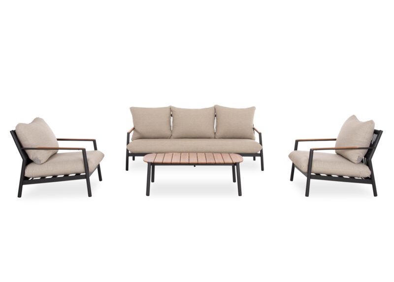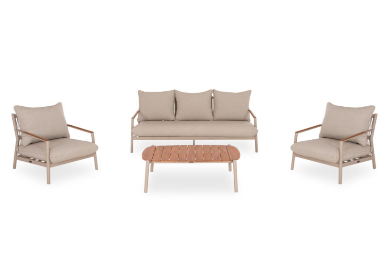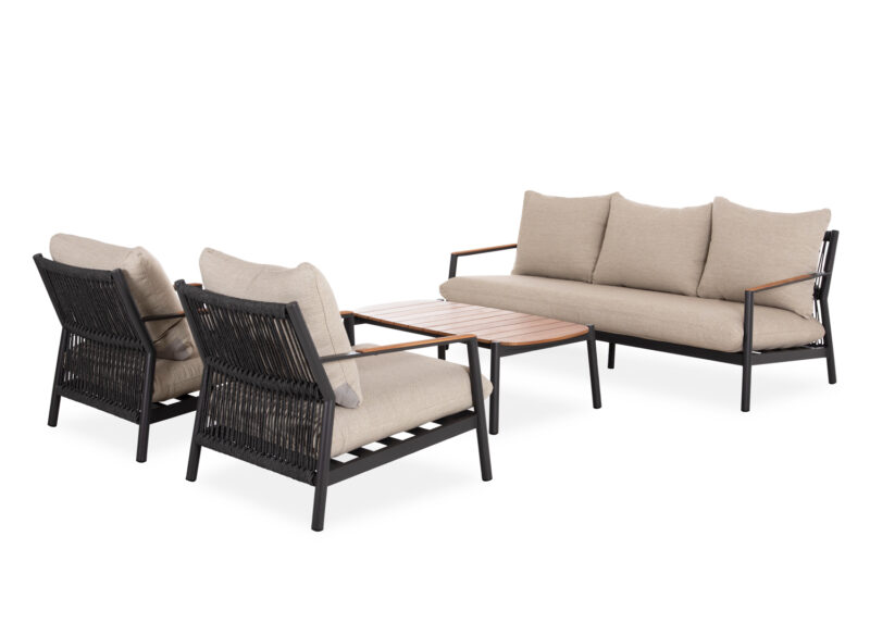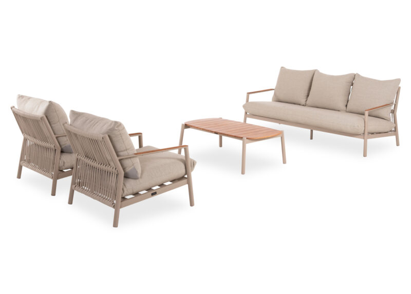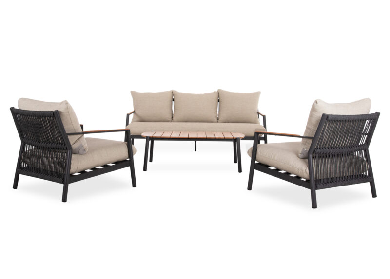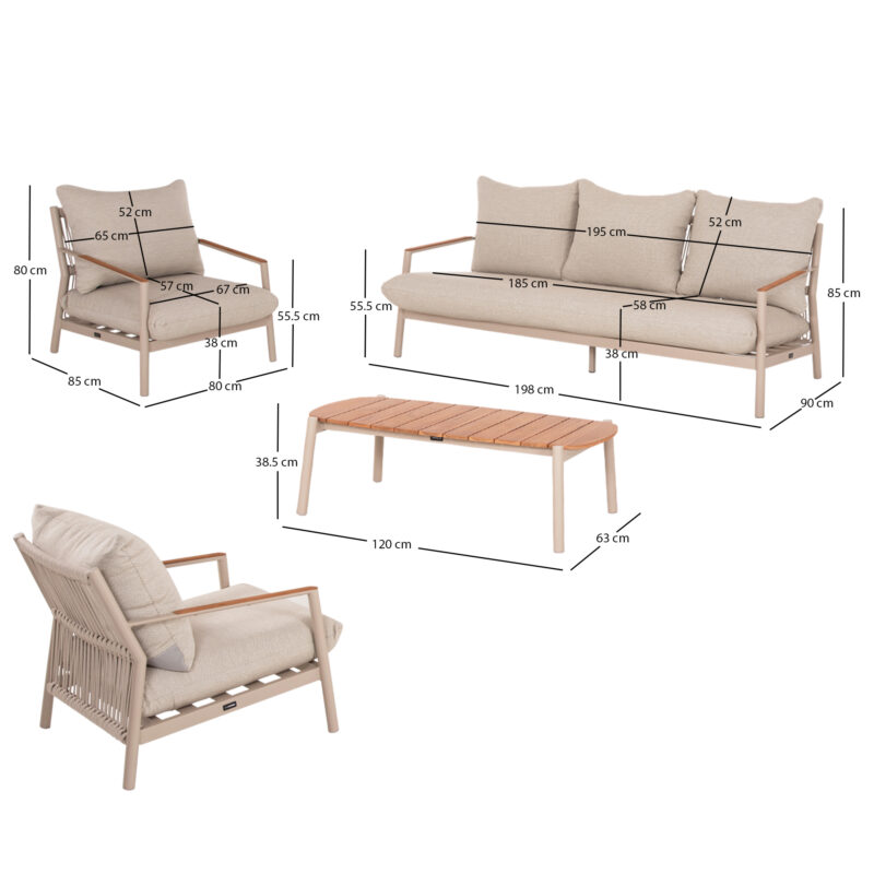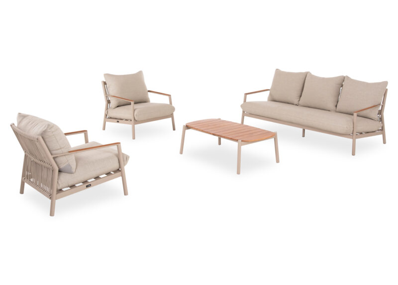 Αποτελείται από έναν 3-θέσιο καναπέ, δύο υπέροχες πολυθρόνες, και ένα ορθογώνιο τραπεζάκι! Υπάρχουν δύο χρωματικές επιλογές. Η πρώτη να είναι ο σκελετός τους από αλουμίνιο σε ΜΠΕΖ χρώμα με σχοινί στην πλάτη σε παρόμοιο χρώμα, ενώ τα μαξιλάρια είναι και αυτά σε ΜΠΕΖ χρώμα και η δεύτερη, ο σκελετός τους να είναι από αλουμίνιο σε ΑΝΘΡΑΚΙ χρώμα με σχοινί στην πλάτη σε παρόμοιο χρώμα, ενώ τα μαξιλάρια είναι σε ΜΠΕΖ χρώμα. Και στις δύο περιπτώσεις, το ξύλο teak στην επιφάνεια του τραπεζιού, επένδυση στα μπράτσα του καναπέ και στις πολυθρόνες επιτείνει την αίσθηση πολυτέλειας! Πέρα από τακτικό ξεσκόνισμα, μπορείτε να χρησιμοποιείτε ένα υγρό πανί. Μην χρησιμοποιείτε χημικά καθαριστικά.
