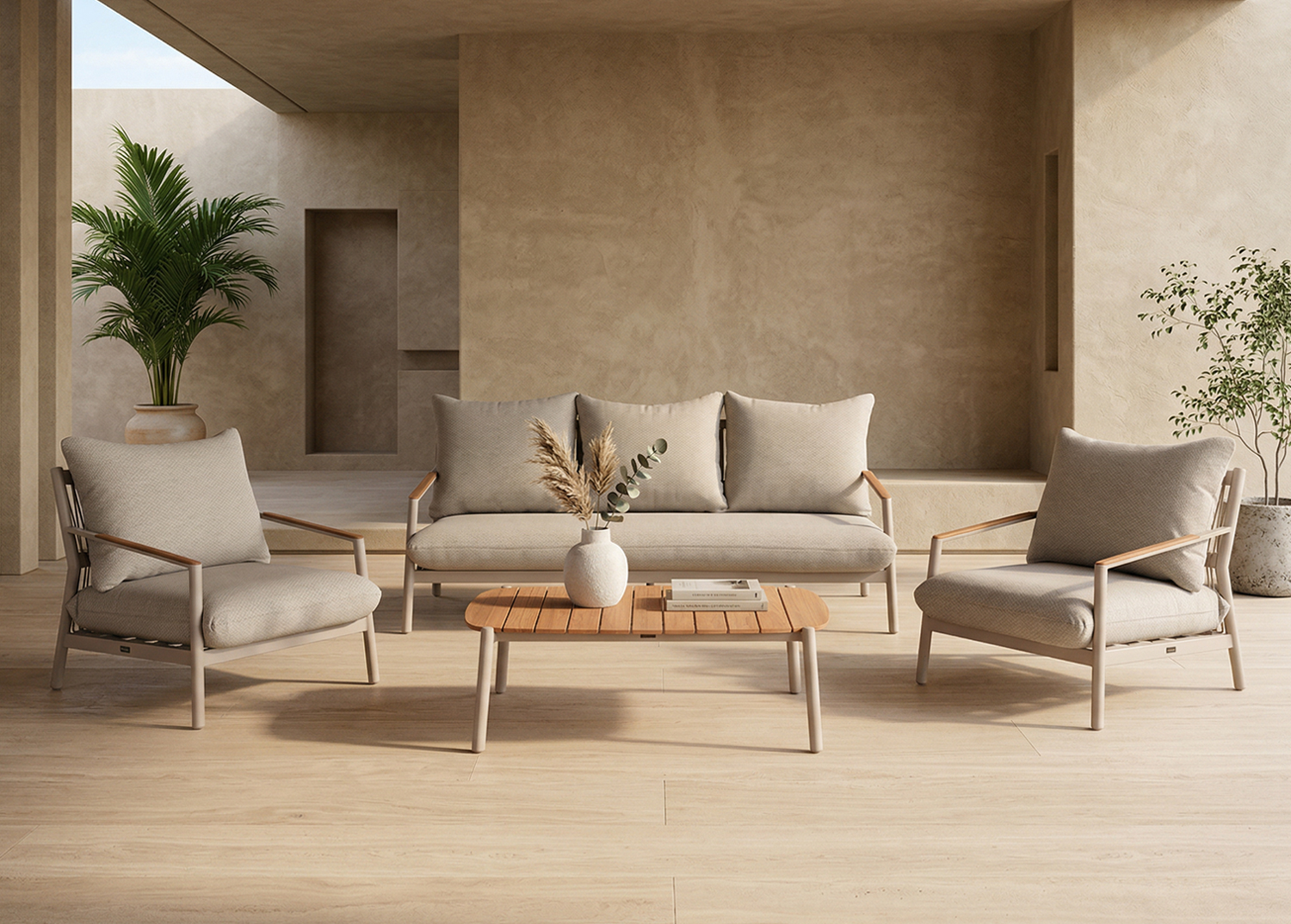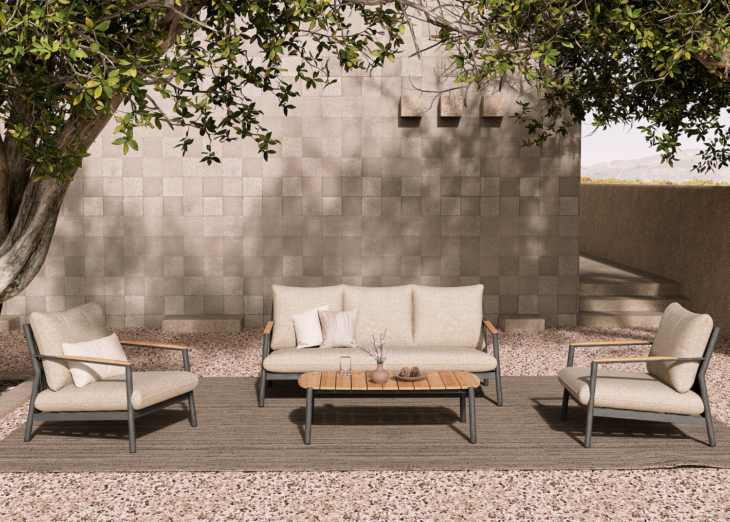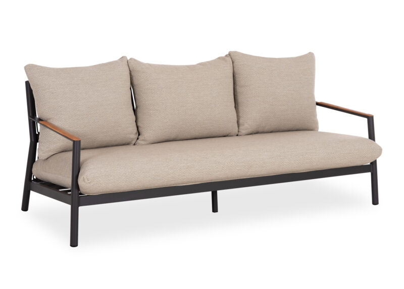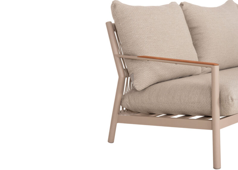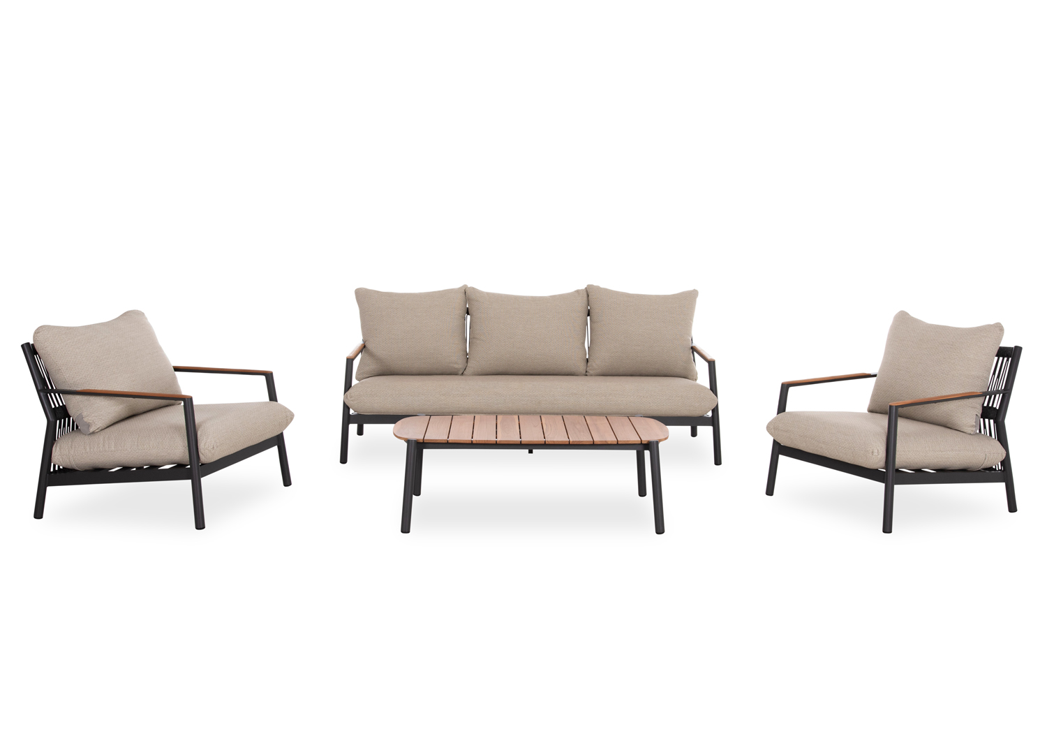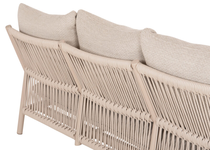Αποτελείται από έναν 3-θέσιο καναπέ, δύο υπέροχες πολυθρόνες, και ένα ορθογώνιο τραπεζάκι! Υπάρχουν δύο χρωματικές επιλογές. Η πρώτη να είναι ο σκελετός τους από αλουμίνιο σε ΜΠΕΖ χρώμα με σχοινί στην πλάτη σε παρόμοιο χρώμα, ενώ τα μαξιλάρια είναι και αυτά σε ΜΠΕΖ χρώμα και η δεύτερη, ο σκελετός τους να είναι από αλουμίνιο σε ΑΝΘΡΑΚΙ χρώμα με σχοινί στην πλάτη σε παρόμοιο χρώμα, ενώ τα μαξιλάρια είναι σε ΜΠΕΖ χρώμα. Και στις δύο περιπτώσεις, το ξύλο teak στην επιφάνεια του τραπεζιού, επένδυση στα μπράτσα του καναπέ και στις πολυθρόνες επιτείνει την αίσθηση πολυτέλειας! Πέρα από τακτικό ξεσκόνισμα, μπορείτε να χρησιμοποιείτε ένα υγρό πανί. Μην χρησιμοποιείτε χημικά καθαριστικά.