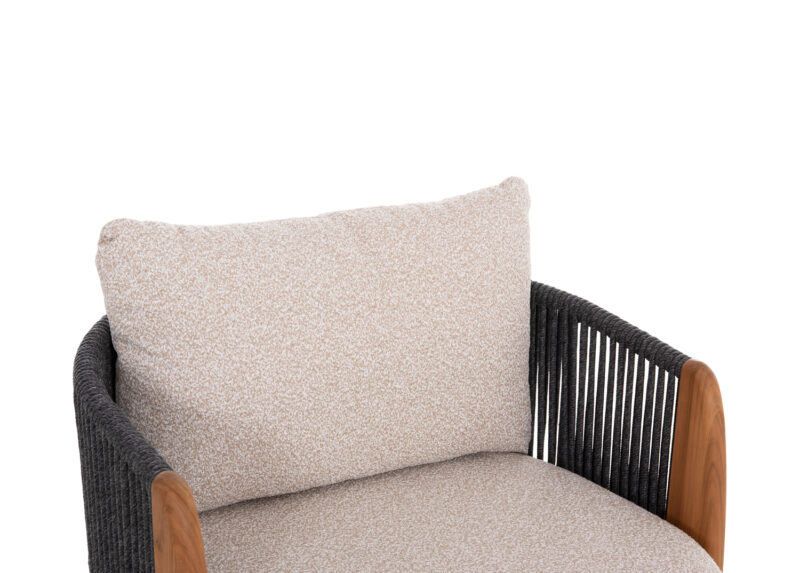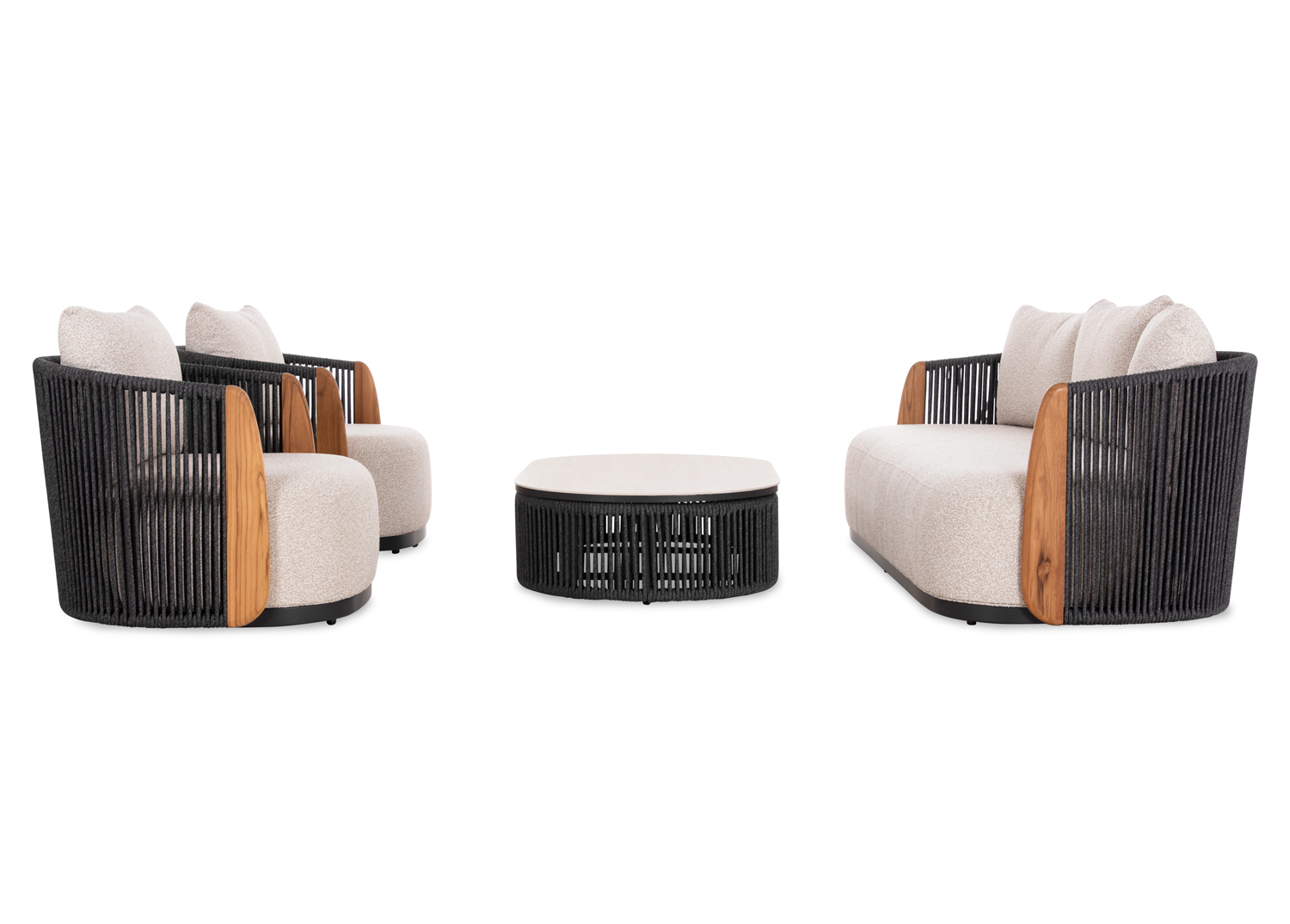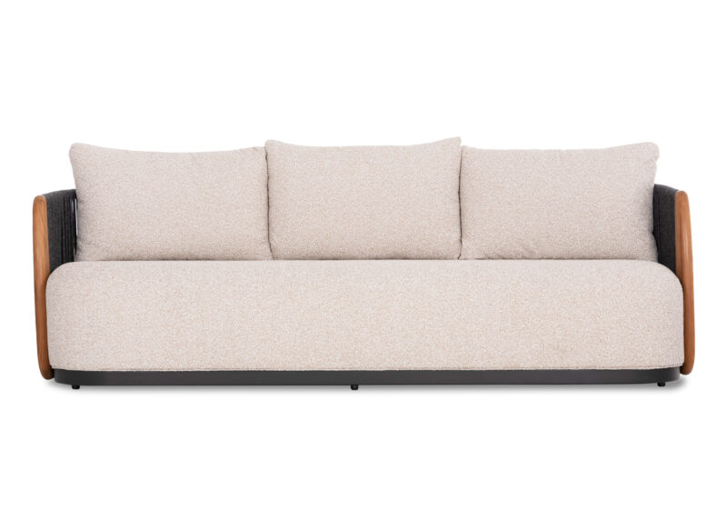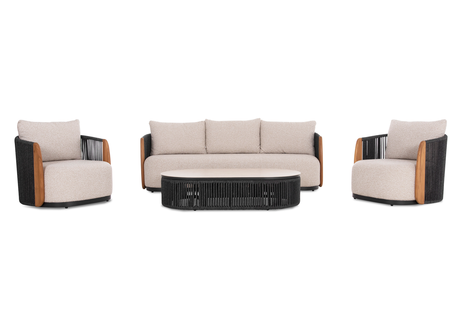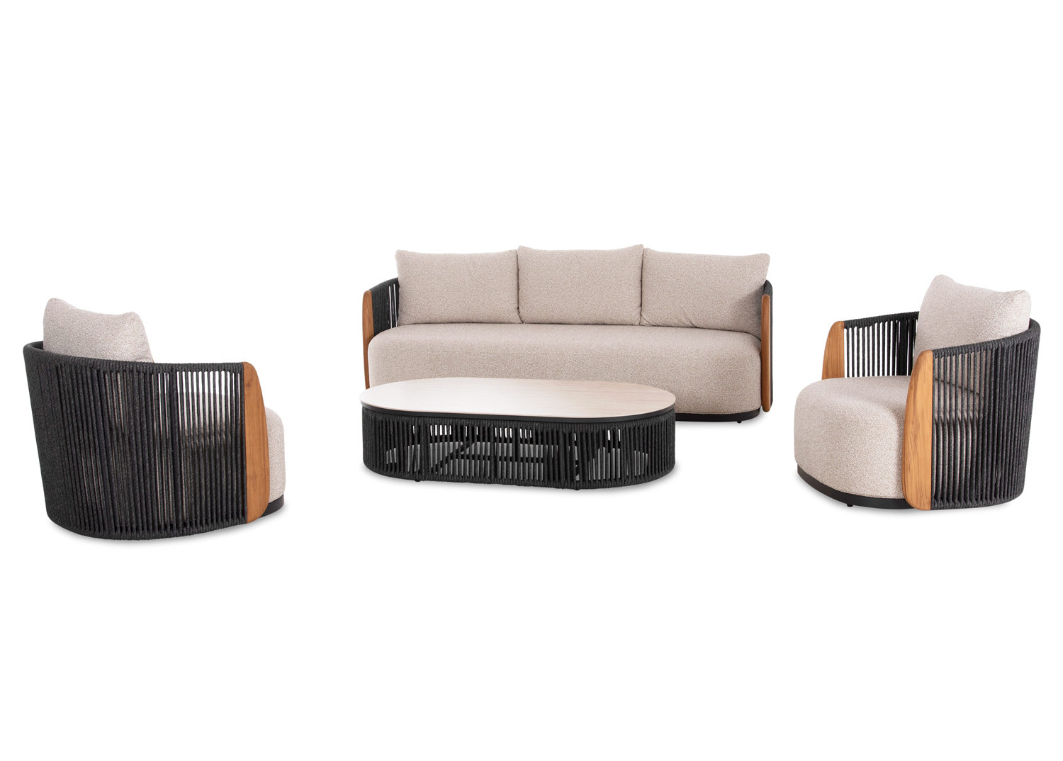 Η σειρά AUGUSTUS, συνδυάζει την απαράμιλλη ποιότητα των υλικών της και του φινιρίσματός της, αλλάζοντας τα δεδομένα στην κατηγορία. Αυτό το σετ 4τμχ και 5 θέσεων αποτελείται από έναν τριθέσιο καναπέ, 2 πολυθρόνες και ένα οβάλ τραπεζάκι με ΜΠΕΖ επιφάνεια από sintered stone. Ο καναπές και οι πολυθρόνες έχουν σκούρο ΓΚΡΙ σκελετό αλουμινίου και σχοινί ενώ τα μαξιλάρια της πλάτης αλλά και στα καθίσματα έχουν επένδυση από OLEFIN ύφασμα σε ΜΠΕΖ χρώμα. Το ξύλο teak στο κάθετο τμήμα των μπράτσων είναι μια επιπλέον πινελιά πολυτέλειας σε όλο το σετ. Πέρα από τακτικό ξεσκόνισμα, μπορείτε να χρησιμοποιείτε ένα υγρό πανί. Μην χρησιμοποιείτε χημικά καθαριστικά.