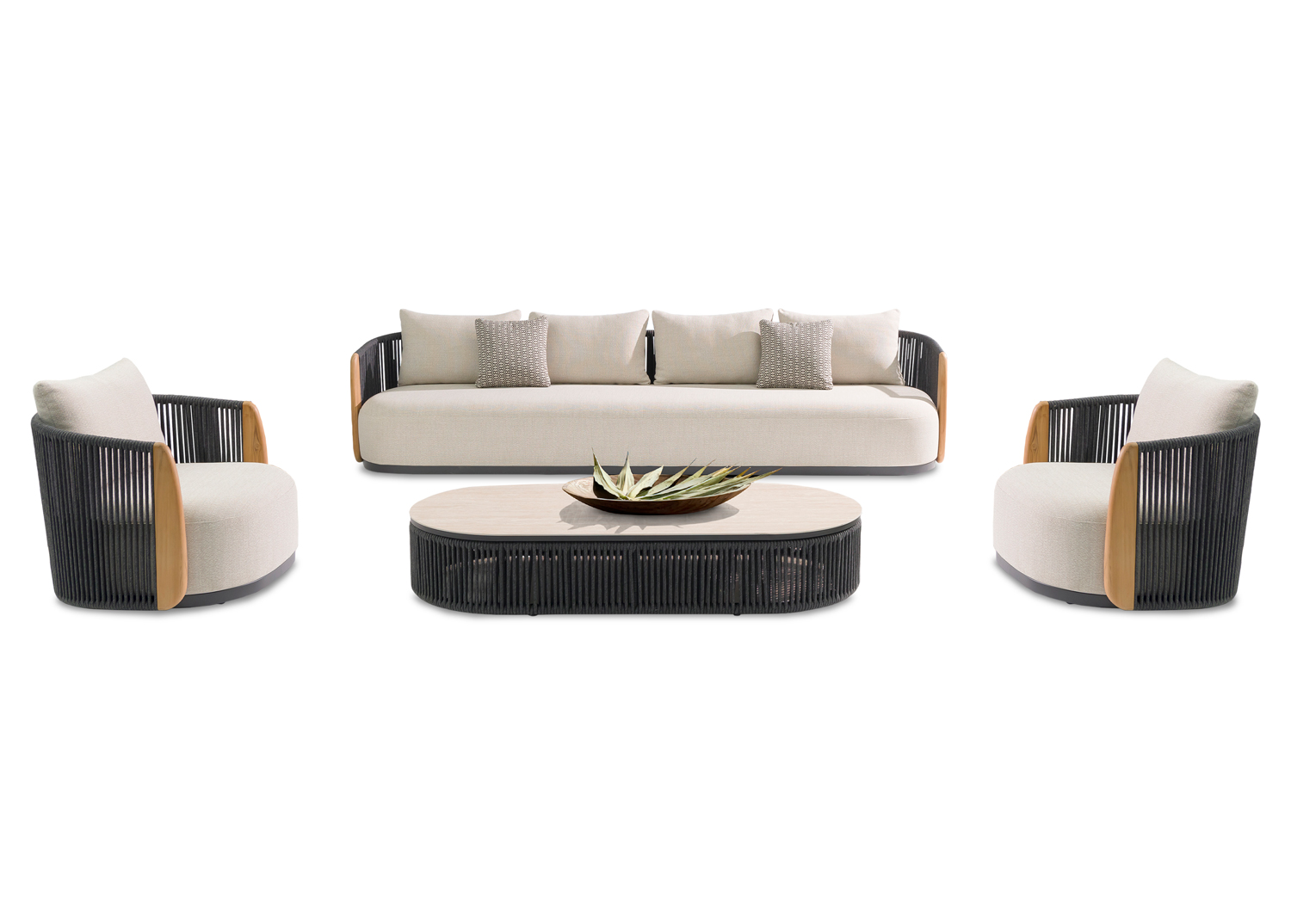 Η σειρά AUGUSTUS, συνδυάζει την απαράμιλλη ποιότητα των υλικών της και του φινιρίσματός της, αλλάζοντας τα δεδομένα στην κατηγορία. Αυτό το σετ 4τμχ και 6 θέσεων αποτελείται από έναν 4-θέσιο καναπέ, 2 πολυθρόνες και ένα οβάλ τραπεζάκι με ΜΠΕΖ επιφάνεια από sintered stone. Ο καναπές και οι πολυθρόνες έχουν σκούρο ΓΚΡΙ σκελετό αλουμινίου και σχοινί ενώ τα μαξιλάρια της πλάτης αλλά και στα καθίσματα έχουν επένδυση από OLEFIN ύφασμα σε ΜΠΕΖ χρώμα. Το ξύλο teak στο κάθετο τμήμα των μπράτσων είναι μια επιπλέον πινελιά πολυτέλειας σε όλο το σετ. Πέρα από τακτικό ξεσκόνισμα, μπορείτε να χρησιμοποιείτε ένα υγρό πανί. Μην χρησιμοποιείτε χημικά καθαριστικά.