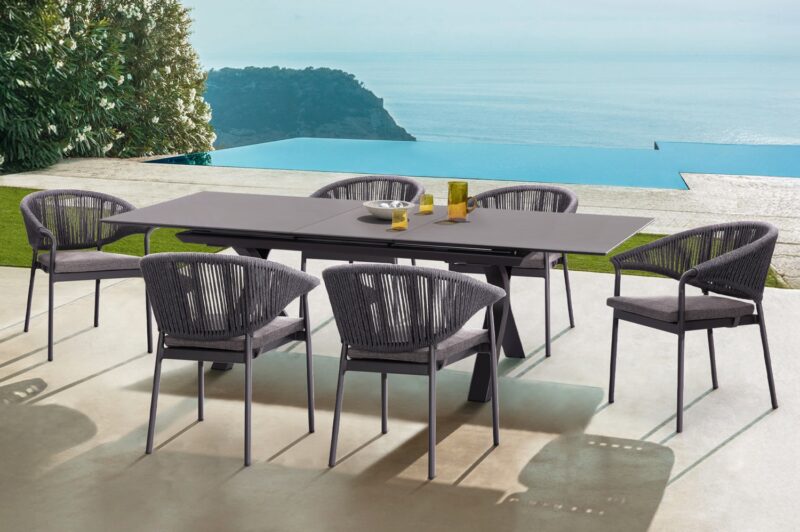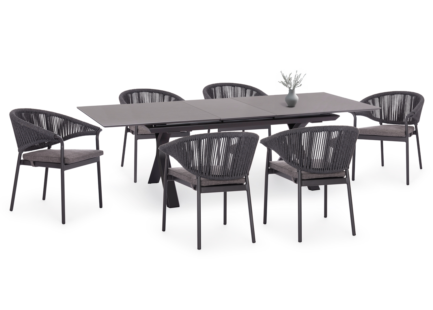 Η SYMETRON μεταμορφώνει τον εξωτερικό σας χώρο με ακόμα ένα νέο σετ τραπεζαρίας 6 θέσεων ANDROMEDA (L)! Με ποιότητα κατασκευής και υλικών, απαράμιλλη αισθητική αλλά και μοντέρνο design, το ANDROMEDA (L) συνδυάζει υπέροχα την πρακτικότητα με την πολυτέλεια. Αποτελείται από ένα επεκτεινόμενο τραπέζι και 6 στιλάτες πολυθρόνες τραπεζαρίας με επένδυση σχοινί. Πέρα από τακτικό ξεσκόνισμα, μπορείτε να καθαρίζετε την επιφάνεια με ένα υγρό πανί, ακόμα και με διάφορα καθαριστικά από τα πολλά που κυκλοφορούν στην αγορά, αρκεί να μην περιέχουν χημικά συστατικά.