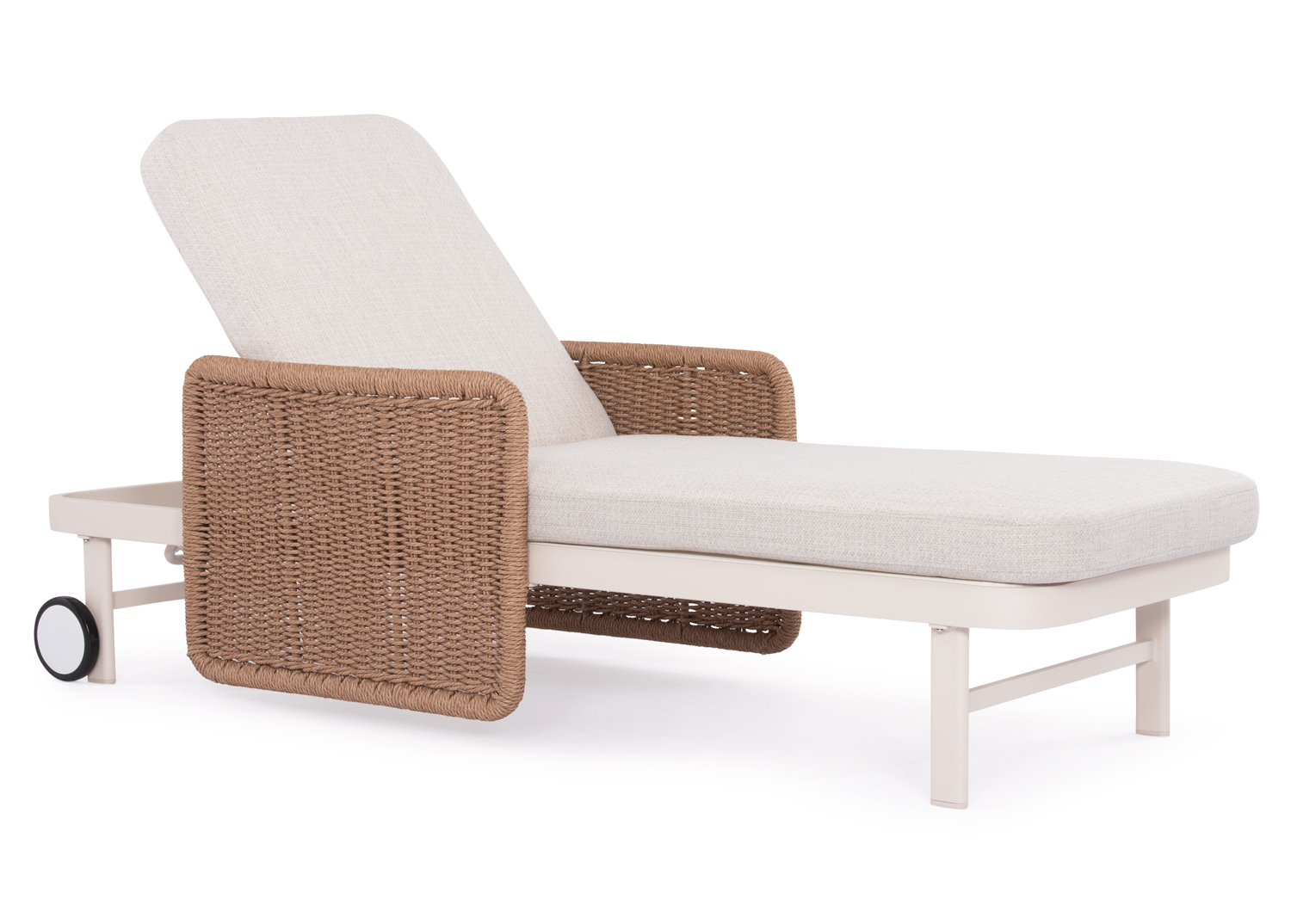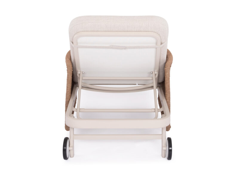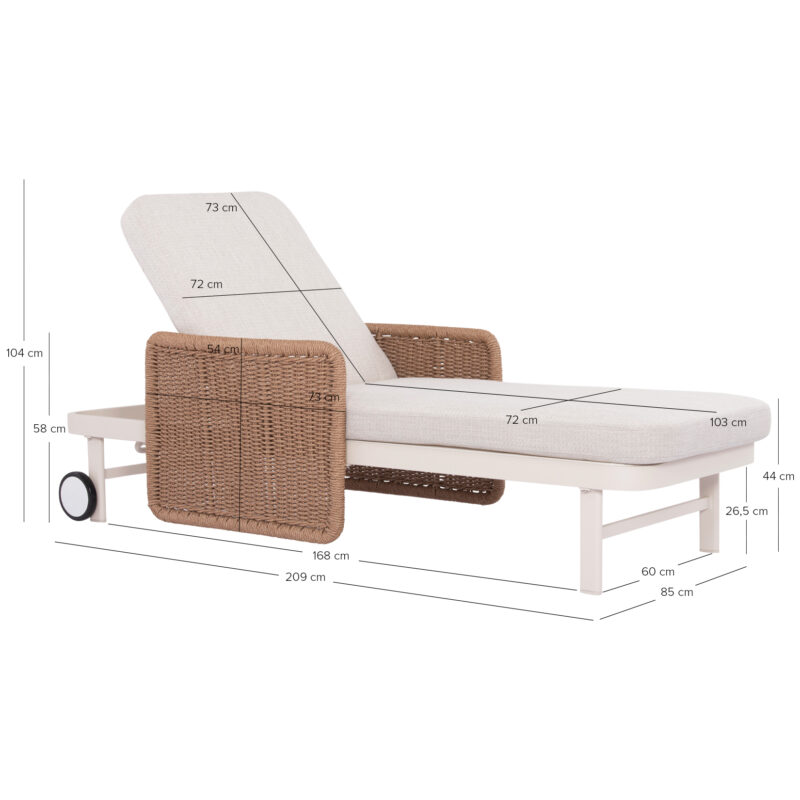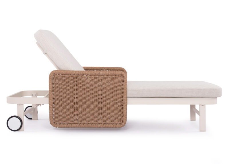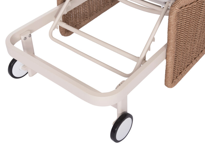 Σας παρουσιάζουμε μια πολυτελή ξαπλώστρα αλουμινίου της σειράς DESTINY. Μια σειρά που, μαζί με άλλες, ανεβάζει τον πήχη της ποιότητας και της αισθητικής που προσφέρουμε σε εσάς, τόσο για το σπίτι, όσο και για κάθε ανάλογο επαγγελματικό χώρο! Με απαράμιλλη ποιότητα κατασκευής και υλικών, θα αναβαθμίσει την εικόνα σε όποιο χώρο επιθυμείτε. Ο σκελετός αυτής της ξαπλώστρας είναι σε χρώμα ΕΚΡΟΥ, ενώ τα μπράτσα της είναι επενδυμένα με rattan σε πλέξη wicker. Επίσης, ο σκελετός αυτής της ξαπλώστρας υπάρχει και σε ΑΝΘΡΑΚΙ χρώμα, ενώ τα μπράτσα της είναι επενδυμένα με rattan σε πλέξη wicker σε ΓΚΡΙ χρώμα. Η ανάκλιση πραγματοποιείται με κλασική «σκαλιέρα» 4 θέσεων συν μία που είναι η οριζόντια. Το επάνω μέρος του στρώματος διαθέτει κορδόνια που δένονται με «χρατς» ενώ το κυρίως στρώμα «κολλάει» στην ξαπλώστρα επίσης με «χρατς», τα οποία βρίσκονται στο πανί textilene που λειτουργεί και ως βάση για το στρώμα. Τέλος, η ξαπλώστρα διαθέτει και 2 ρόδες για εύκολη μετακίνηση! Πέρα από τακτικό ξεσκόνισμα, μπορείτε να την σκουπίζετε με ένα υγρό πανί. Μην χρησιμοποιείτε χημικά καθαριστικά, παρά μόνο ήπια καθαριστικά όταν χρειαστεί.