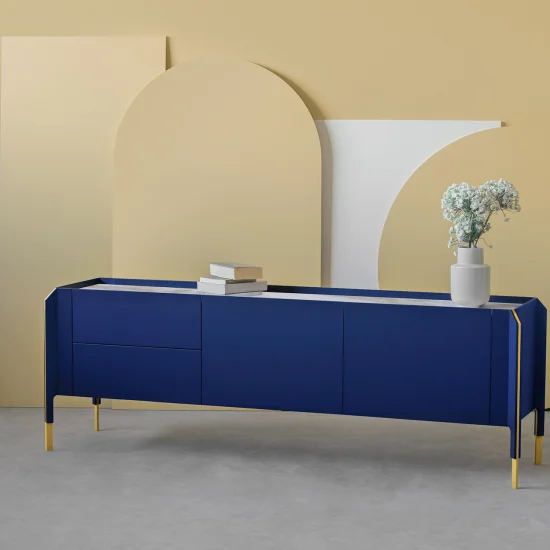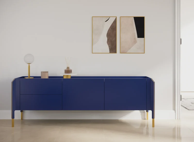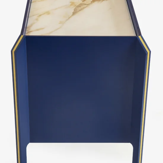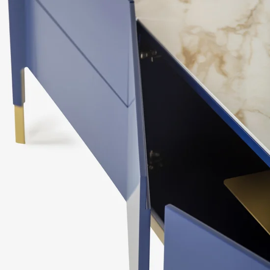 Η απόχρωση Sapphire Blue, σε συνδυασμό με μεταλλικά στοιχεία σε ορείχαλκο, δημιουργεί ένα δυναμικό και ιδιαίτερο αποτέλεσμα. Τα πάνελ τοποθετούνται αρμονικά μεταξύ τους, δίνοντας μια αίσθηση ελαφρότητας και κομψότητας.