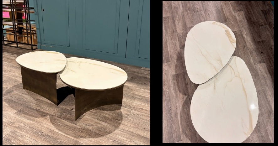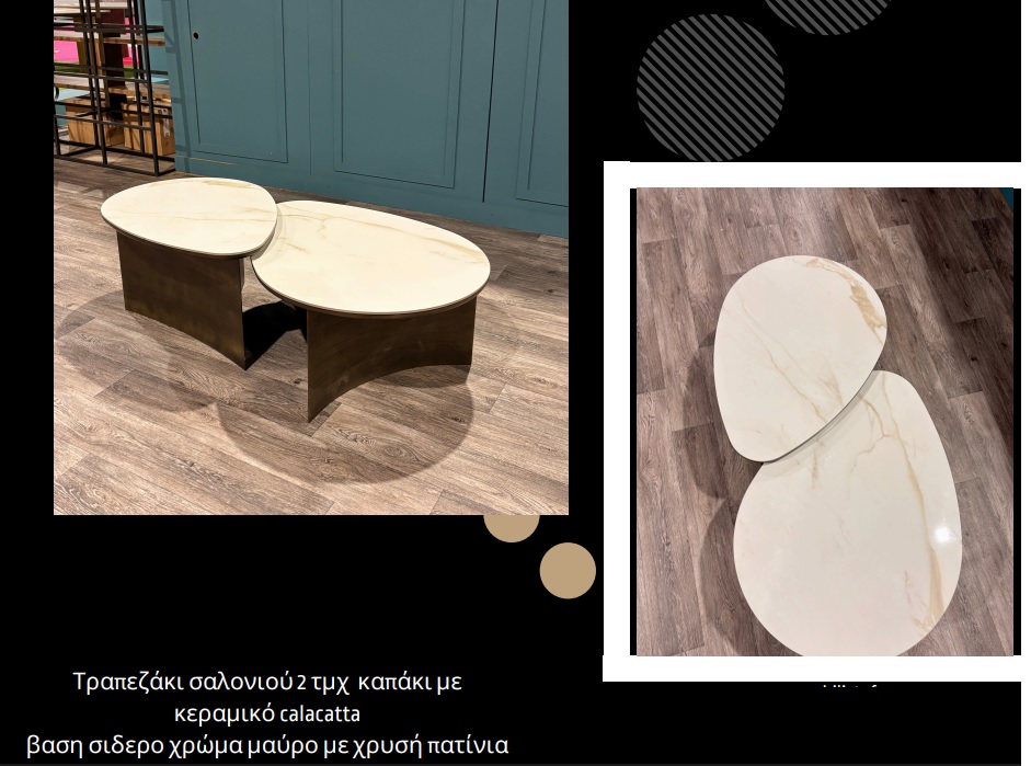 Ένα εντυπωσιακό σετ δύο τεμαχίων με ασύμμετρο σχεδιασμό που συνδυάζει την αριστοκρατική όψη του μαρμάρου με το βιομηχανικό μέταλλο. Επιφάνεια από κεραμικό Calacatta υψηλής αντοχής με κομψά νερά. Σιδερένιος σκελετός σε μαύρο χρώμα με χειροποίητη χρυσή πατίνα.