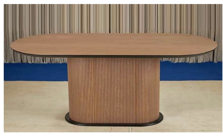- Διακοσμητική Βάση: Η στιβαρή κεντρική βάση του ακολουθεί το σχήμα της επιφάνειας και είναι επενδυμένη με κάθετα πηχάκια (ραμποτέ), δημιουργώντας ένα παιχνίδισμα με το φως και τη σκιά.