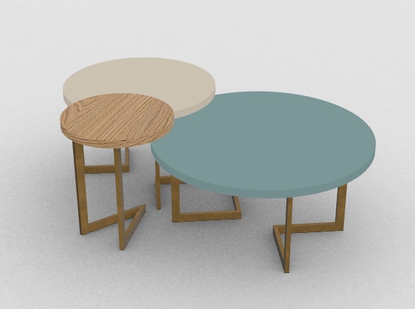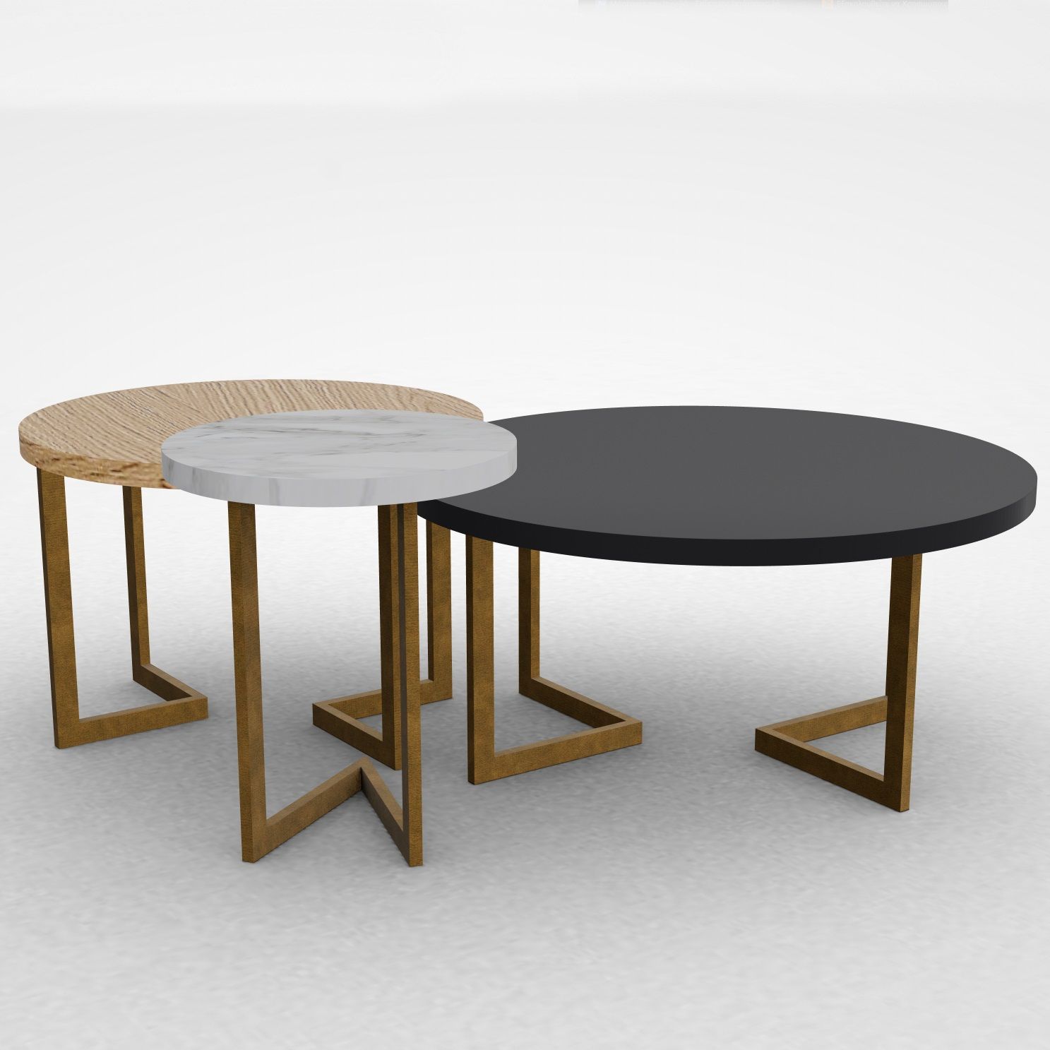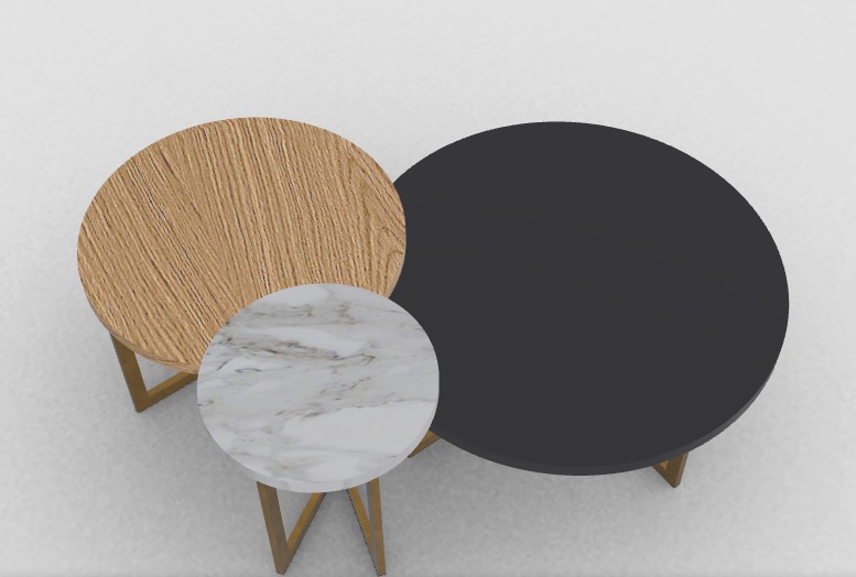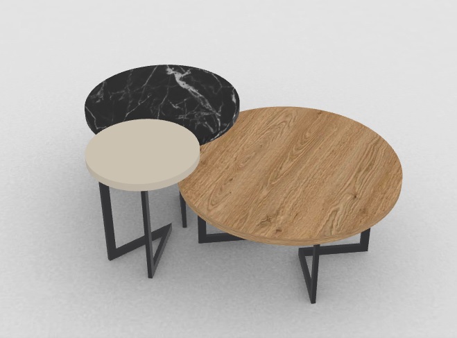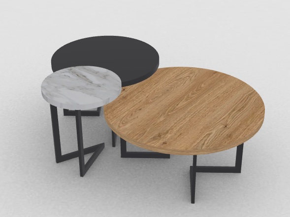 Σετ από τρία μοντέρνα τραπεζάκια σαλονιού που συνδυάζουν αισθητική και λειτουργικότητα. Το σετ αποτελείται από τρία στρογγυλά τραπέζια διαφορετικού μεγέθους και υλικών: ένα σε φυσικό ξύλο δρυς, ένα σε λευκό μαρμάρινο εφέ και ένα σε κομψό μαύρο ματ φινίρισμα ή γυαλί. Οι μεταλλικές βάσεις σε γεωμετρικό σχεδιασμό προσφέρουν σταθερότητα και μια σύγχρονη πινελιά.