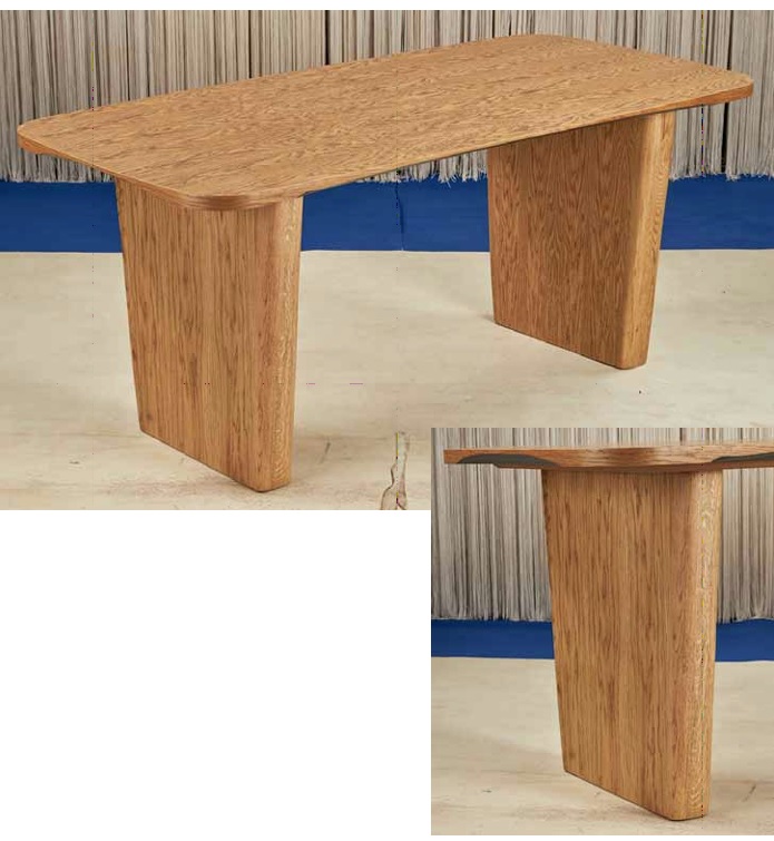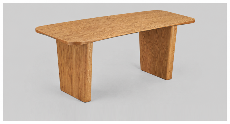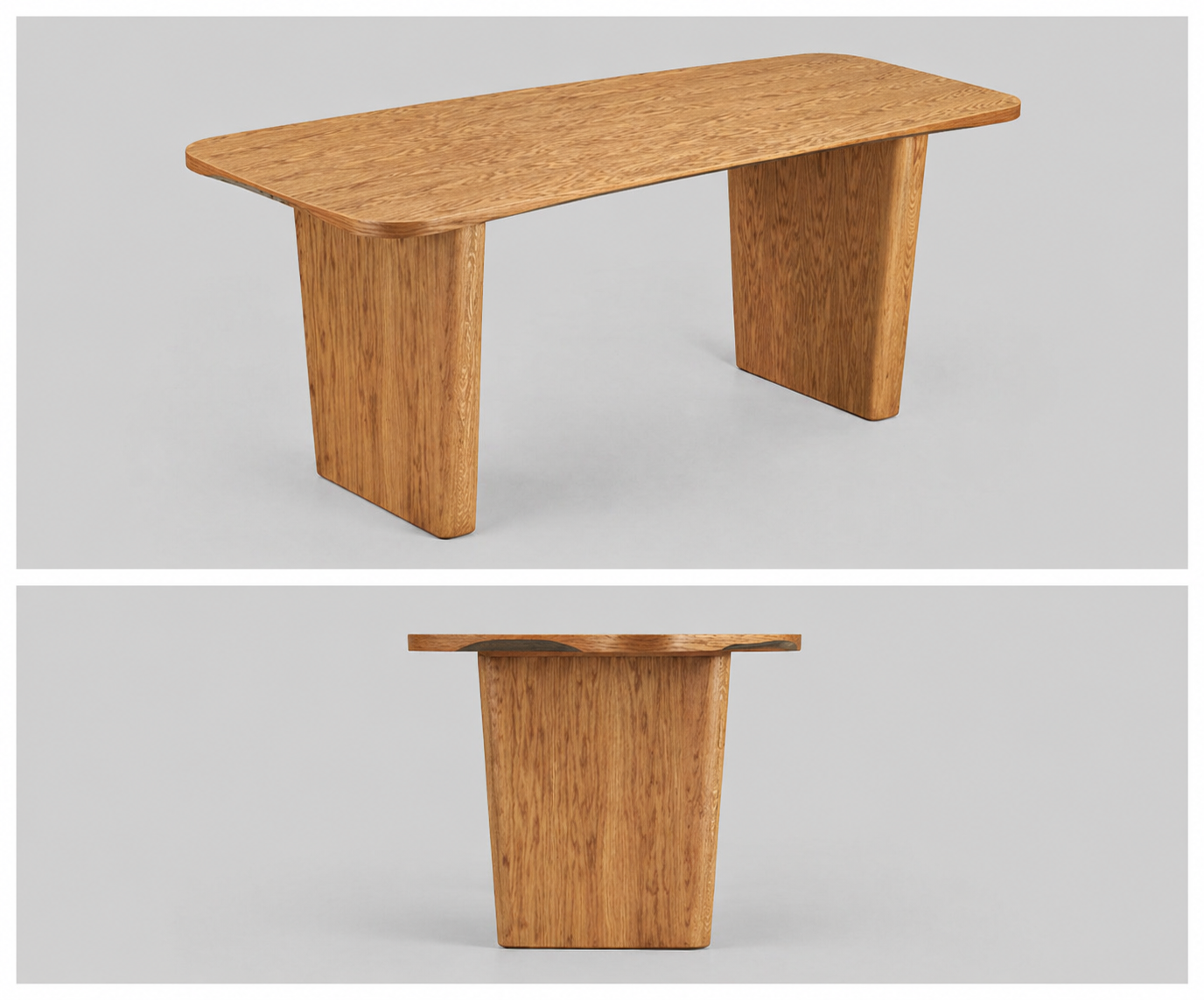 Η επιφάνεια διαθέτει στρογγυλεμένες γωνίες για μια πιο απαλή και κομψή εμφάνιση, ενώ τα φαρδιά, γεωμετρικά πόδια προσδίδουν σταθερότητα και έναν industrial χαρακτήρα. Κατασκευασμένο από 100% φυσικό ξύλο δρυός.