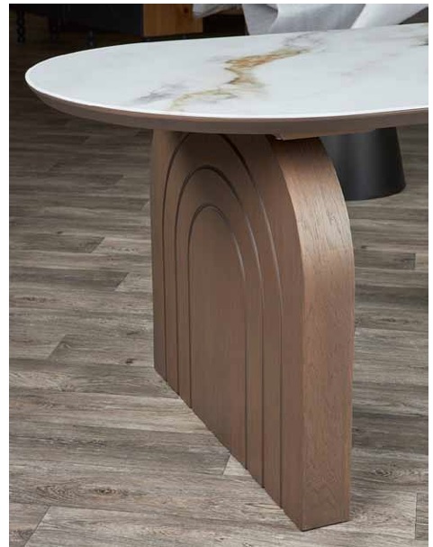 Ένα έργο που ισορροπεί ανάμεσα στη μοντέρνα τέχνη και την λειτουργικότητα. Το κύριο χαρακτηριστικό του είναι οι επιβλητικές βάσεις σε σχήμα αψίδας, οι οποίες προσδίδουν κύρος και μοναδικό χαρακτήρα τόσο στην τραπεζαρία όσο και στο τραπεζάκι σαλονιού του σετ.