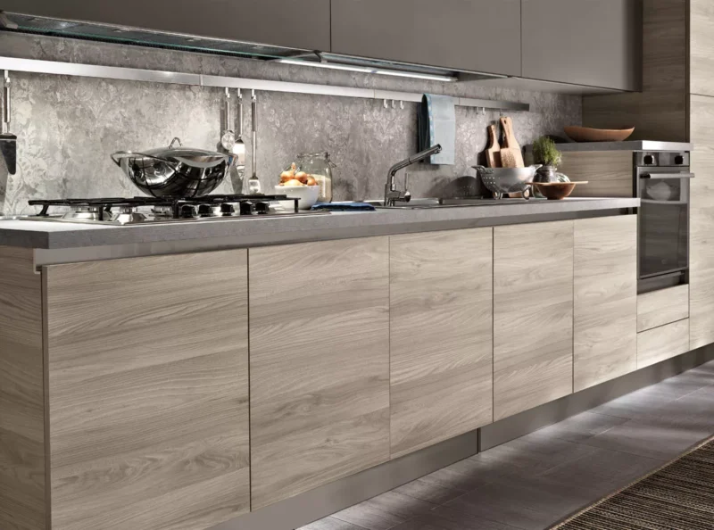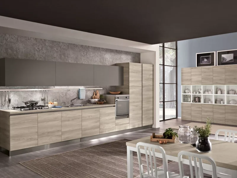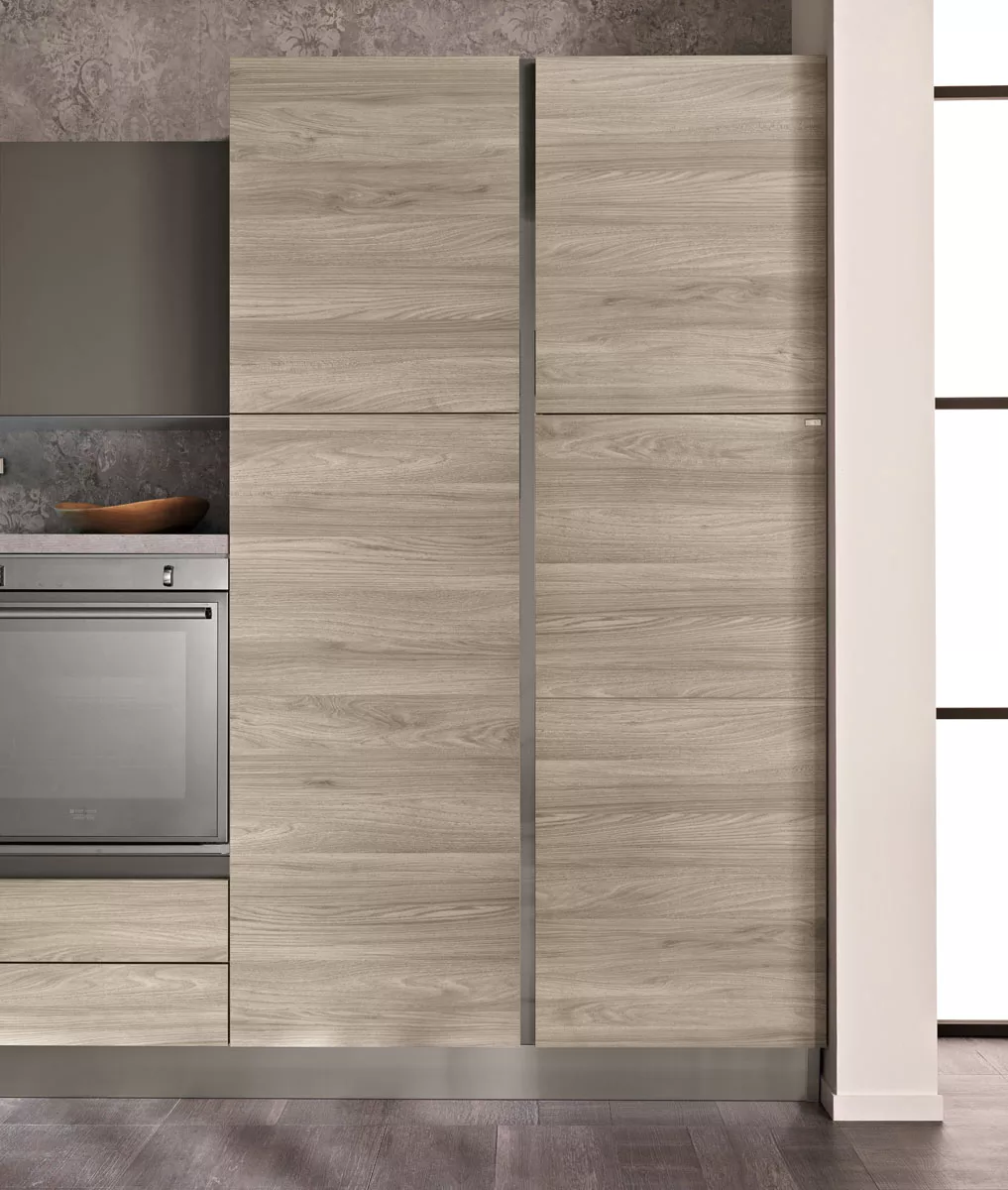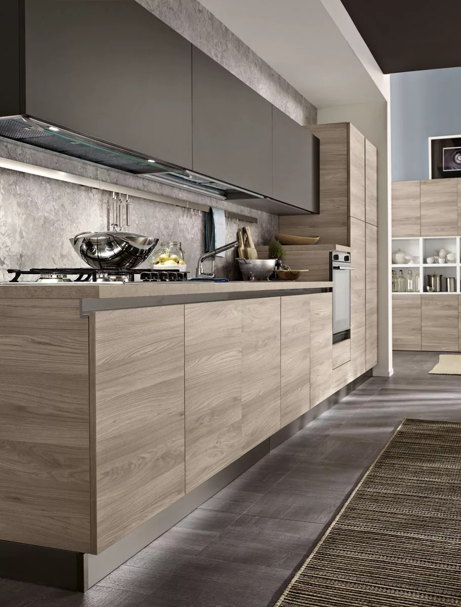 Η Tokyo 50 είναι μια μοντέρνα κουζίνα σχεδιασμένη για ανοιχτούς χώρους, όπου ο ανοιχτός χώρος αναδιαμορφώνει τις παραδοσιακές έννοιες του καθιστικού και της κουζίνας, δημιουργώντας έναν χώρο όπου όλα βρίσκουν την τέλεια θέση τους. Αυτή η κουζίνα προωθεί την έννοια της προσαρμογής και της ελαφρότητας, παίζοντας με συμπαγείς και άδειους χώρους. Ο τοίχος, που αποτελείται από μια διπλή σειρά από γκρι πόρτες από φτελιά, διανθισμένη με μια διπλή σειρά από ανοιχτά λευκά ράφια, γίνεται ο ιδανικός χώρος για να προσαρμόσετε ανάλογα με το γούστο σας. Η εστία, ο νεροχύτης, ο φούρνος και το ψυγείο βρίσκονται σε ίσες αποστάσεις, παρέχοντας μεγάλη ελευθερία κινήσεων και μεταφέροντας ισορροπία και αρμονία σε ολόκληρο τον χώρο. Το σκούρο γκρι χρώμα των θυρών που βρίσκονται στην κορυφή δημιουργεί μια περίμετρο που αποτελεί τον τέλειο συνδυασμό μινιμαλιστικών και πιο σπιτικών στυλ.