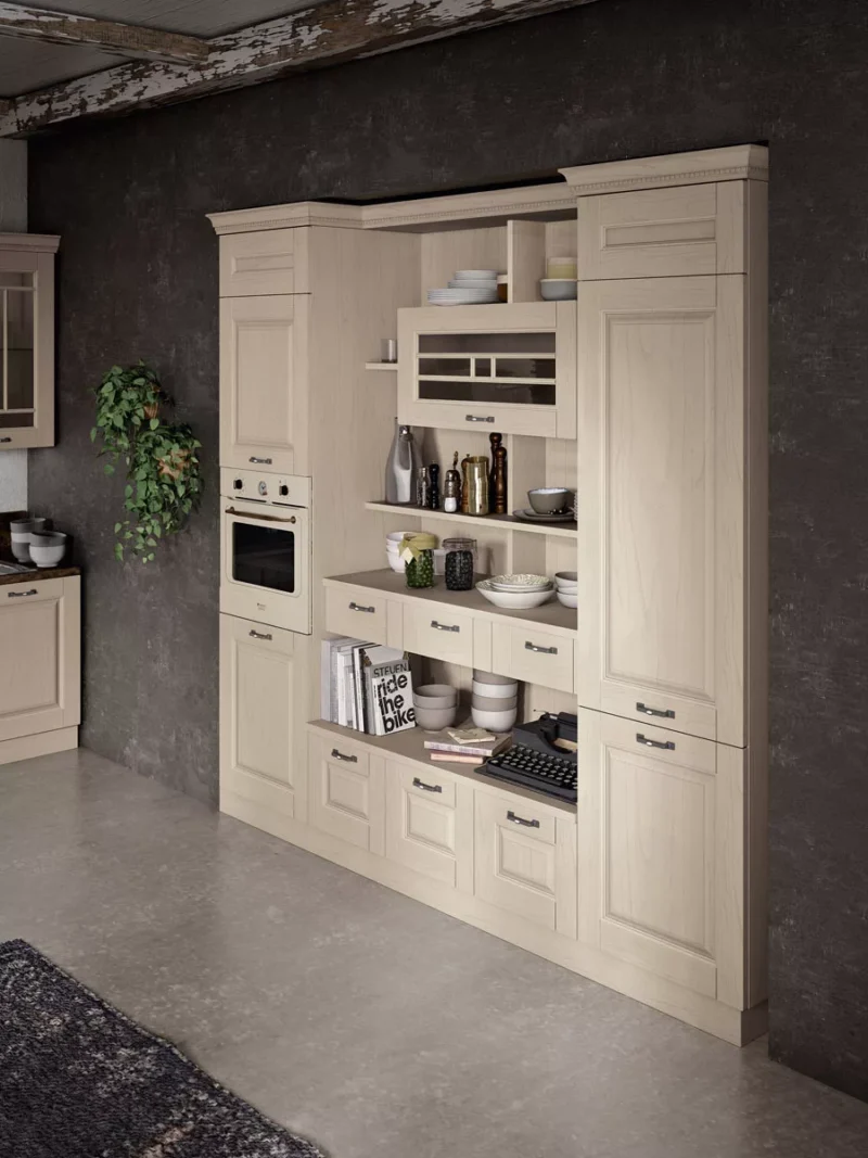 Η έκδοση Bilbao 01 είναι μια φιλόξενη, ζεστή και άνετη κλασική κουζίνα . Με όλη την άνεση και την πρακτικότητα μιας εντοιχιζόμενης ψηλής μονάδας, κάθε στοιχείο είναι ορθολογικά διατεταγμένο, από τις μονάδες βάσης μέχρι τα ντουλάπια βιτρίνας, από τις μονάδες τοίχου μέχρι τις ψηλές μονάδες. Όλα όσα χρειάζεστε είναι πάντα σε κοντινή απόσταση, κάνοντας το κόψιμο, τον κιμά, το πλύσιμο, το ζύμωμα και το μαγείρεμα ευκολότερα. Ένα ξεχωριστό χαρακτηριστικό αυτής της σύνθεσης είναι το σνακ μπαρ, μια μοντέρνα εναλλακτική λύση στο παραδοσιακό τραπέζι, και το επανασχεδιασμένο μπουφέ που ενσωματώνει επίσης τις ψηλές μονάδες που στεγάζουν τον ενσωματωμένο φούρνο. Ένας χώρος για να μοιραστείτε με τα αγαπημένα σας πρόσωπα και σχεδιασμένος με προσοχή, επειδή αντιπροσωπεύει όσους ζουν εκεί, χωρίς να ξεχνάμε ποτέ ότι η κουζίνα παραμένει η καρδιά του σπιτιού.