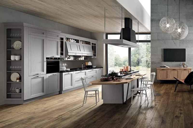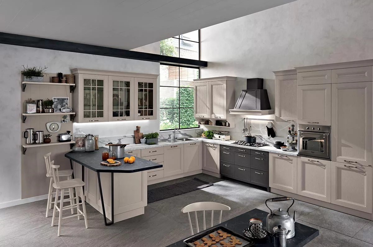 Η κουζίνα του Maryland, με το Vintage στυλ της, χαρακτηρίζεται από λεπτομέρειες, τάσεις και εμπνεύσεις που θυμίζουν περασμένες εποχές, αλλά γίνονται το καθοριστικό αισθητικό χαρακτηριστικό ενός εντελώς νέου στυλ: η μεταλλική κουκούλα με τα τρουκς, οι αντιθέσεις μεταξύ ανοιχτόχρωμων και σκούρων χρωμάτων και η συμπερίληψη γυάλινων θυρών είναι τα πιο εμφανή σημάδια μιας νεωτερικότητας που θυμίζει περασμένες εποχές. Τα ανοιχτά χρώματα αποτελούν τη βάση της σύνθεσης επίπλων, εμπλουτίζοντας τον χώρο με φως και χαλάρωση. Ωστόσο, τα σκούρα χρώματα είναι έντονα παρόντα, τονίζοντας αυτή την αντίθεση με έναν φυσικό αλλά και αποφασιστικό τρόπο. Σκεφτείτε τη μαύρη πέτρα που συνδυάζεται με το λευκό μάρμαρο του πάγκου.