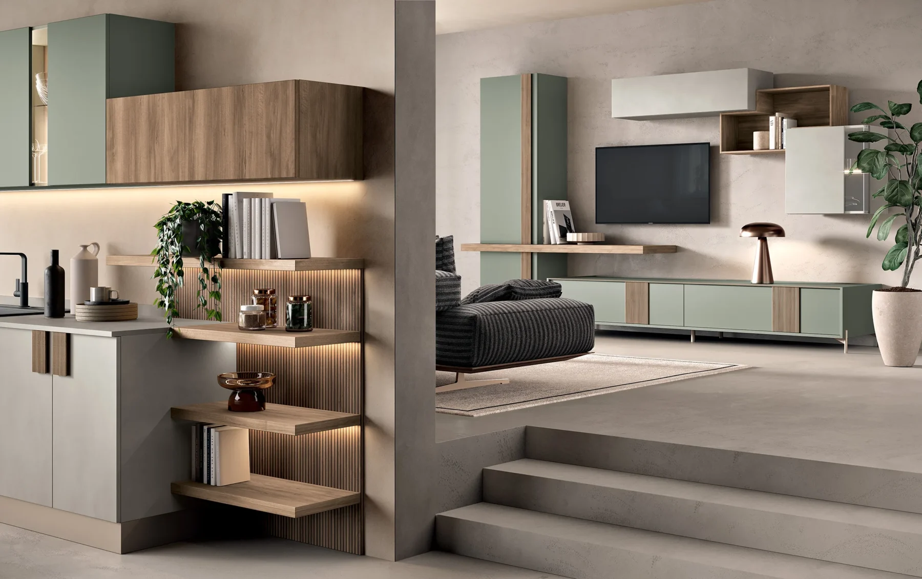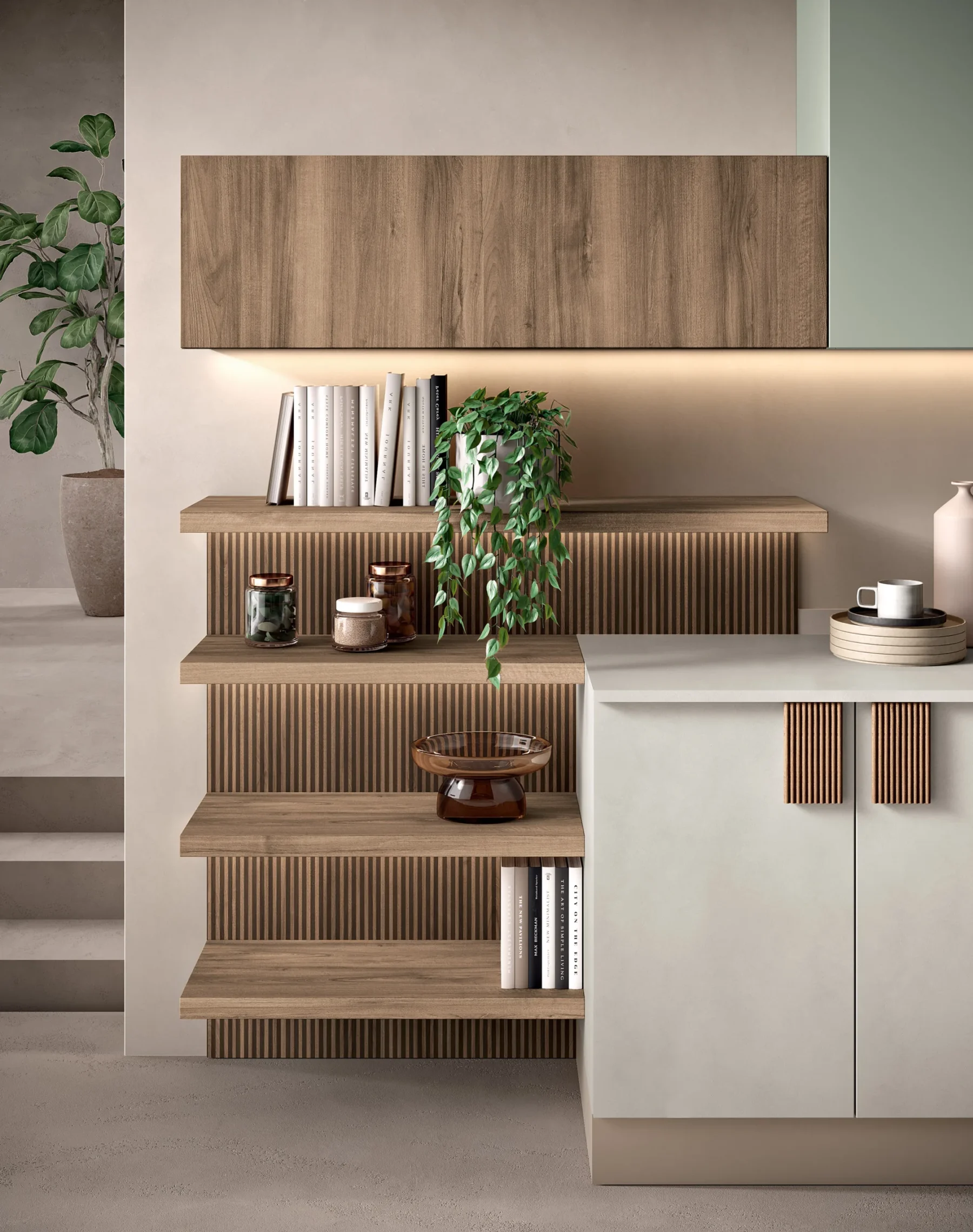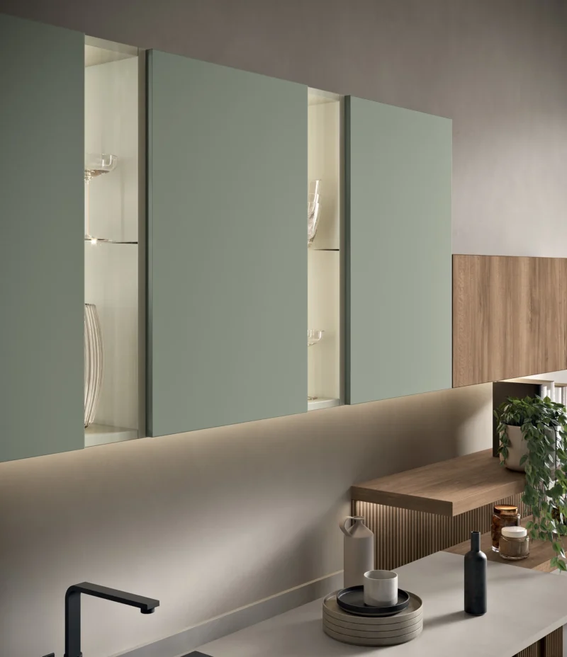 Το Sky /1 συνδυάζει αισθητική και πρακτικότητα: εξοπλισμένες κολώνες, ανοιχτά διαμερίσματα, ράφια και λεπτομέρειες όπως το γυάλινο ένθετο στα ντουλάπια τοίχου βελτιστοποιούν κάθε χώρο, προσφέροντας μέγιστη λειτουργικότητα χωρίς να θυσιάζεται το στυλ.