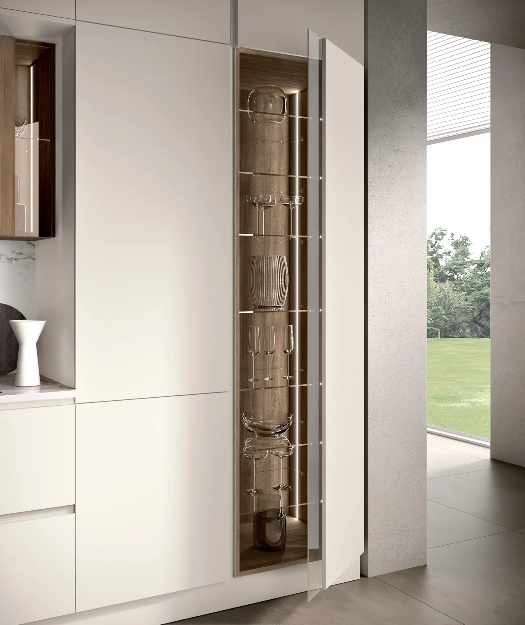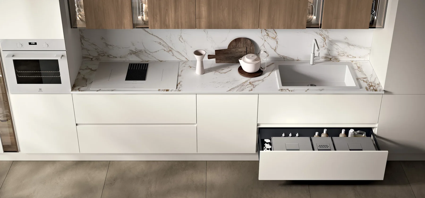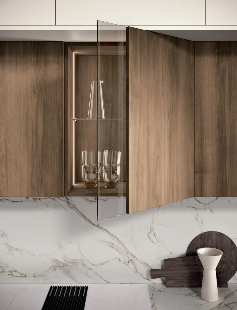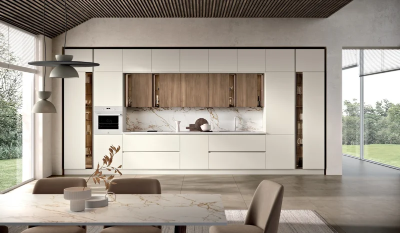 Η κουζίνα “Sky /5” έχει σχεδιαστεί για να συνοδεύει τις καθημερινές χειρονομίες με ρευστότητα και στυλ. Η σύνθεση ακολουθεί την καθαρή εργονομία της κίνησης, ελαχιστοποιώντας τις χειρονομίες και μεγιστοποιώντας την αποτελεσματικότητα. Ένας σχεδιασμός που προωθεί τη φυσική χρήση του χώρου, όπου η αισθητική υπηρετεί τη λειτουργικότητα.