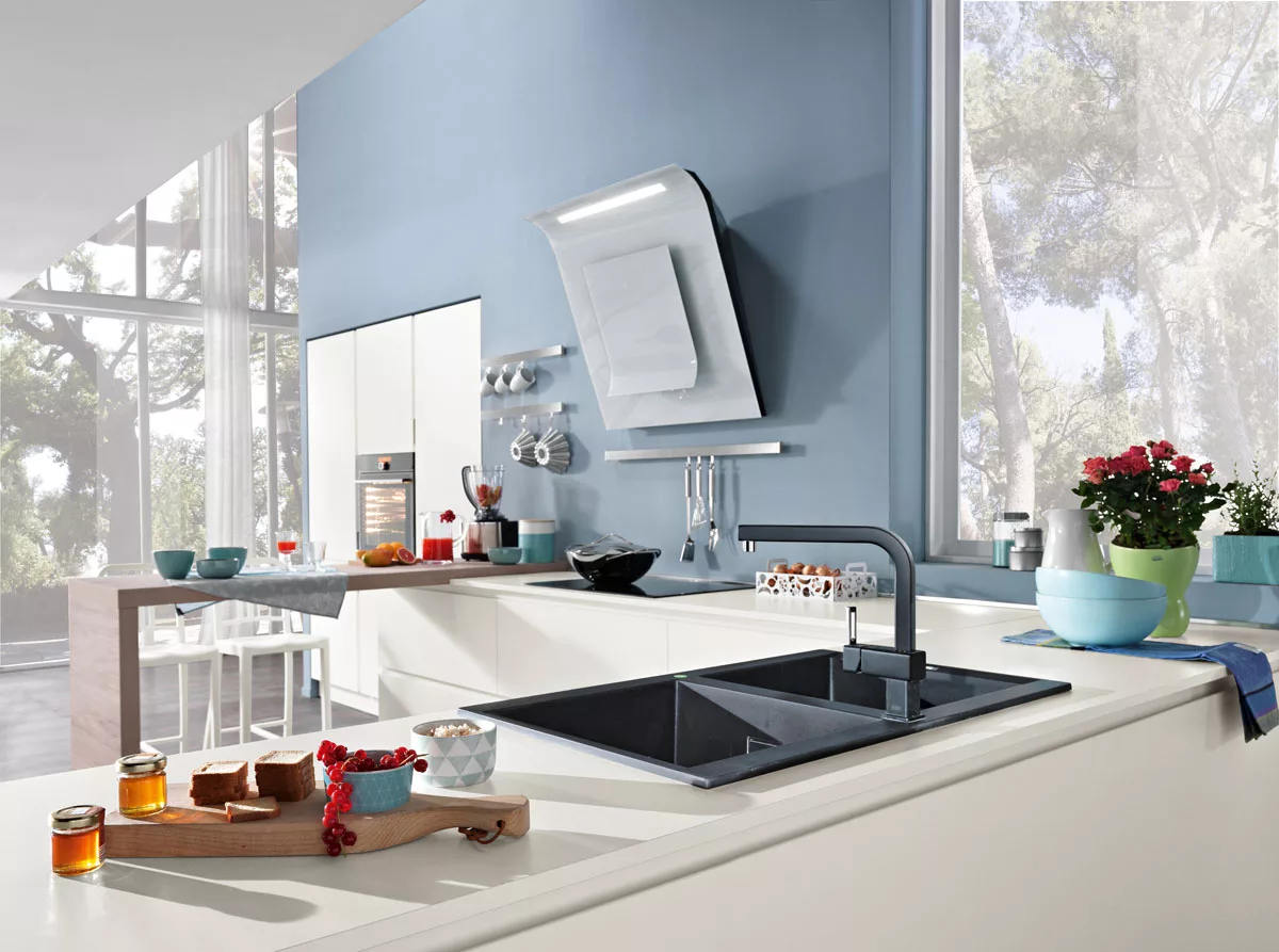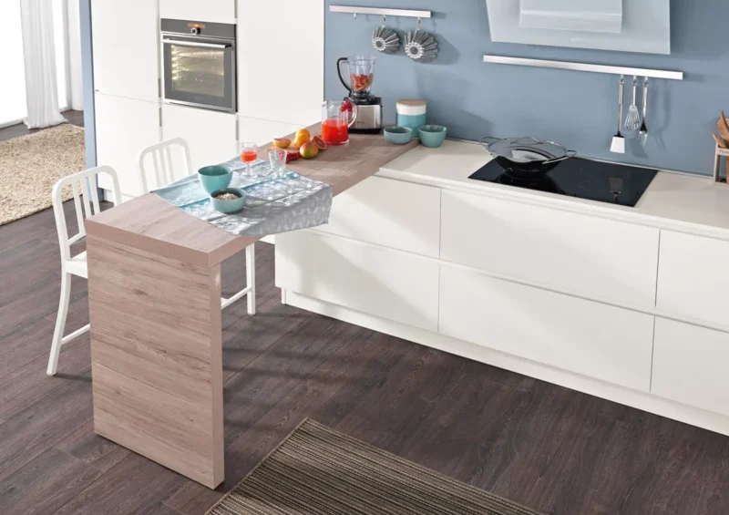 Οι καθαρές, μινιμαλιστικές γραμμές του “Tokyo 44″ ενισχύονται από την παλέτα χρωμάτων που προσδίδει στις γραμμικές, γεωμετρικές φόρμες της κουζίνας μια πινελιά κομψής απλότητας. Οι λευκές επιφάνειες διακόπτονται μόνο από την κεντρική χερσόνησο στο χρώμα του καπουτσίνο, η οποία σχεδόν μοιάζει να σας προσκαλεί στα άλλα δωμάτια του σπιτιού. Το φως φωτίζει κάθε επιφάνεια, ανεμπόδιστα από ντουλάπια ή βιβλιοθήκες. Οι χώροι αποθήκευσης για καθημερινά αντικείμενα χωρίζονται μεταξύ του εσοχικού τοίχου, στο κέντρο του οποίου βρίσκεται ο φούρνος, ο οποίος ακτινοβολεί τη ζεστασιά μιας εστίας, και των χαμηλών, μακριών συρταριών από κάτω. Η εστία είναι κατασκευασμένη από fiberglass, και ο απορροφητήρας, ο οποίος προεξέχει ελαφρώς από τον τοίχο, μοιάζει σχεδόν με σύγχρονο πίνακα στο κέντρο της σκηνής. Αυτή η κουζίνα μεταφέρει την καθαρότητα και την κομψότητα ολόκληρης της γραμμής.
