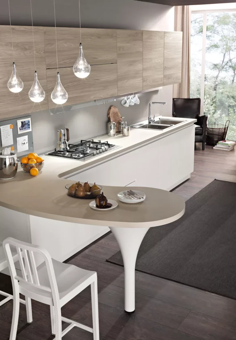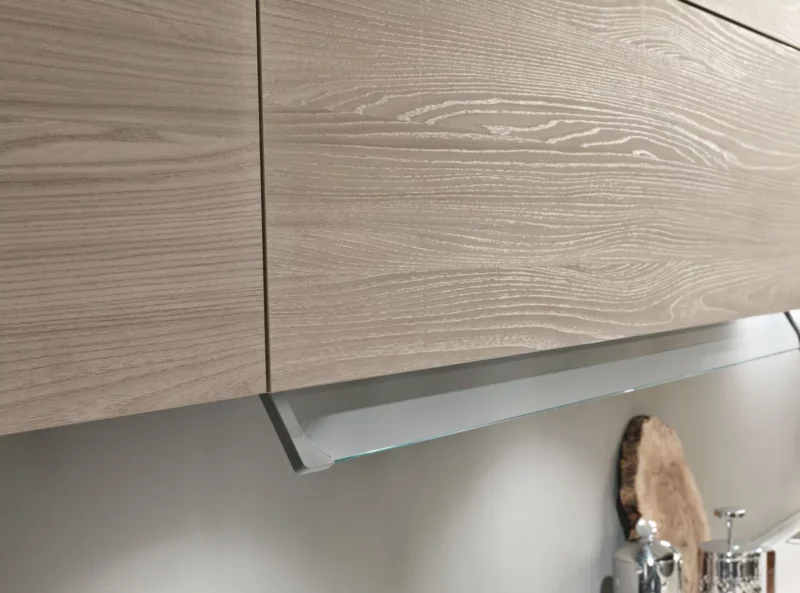 Η Tokyo 56 είναι μια μοντέρνα κουζίνα σχεδιασμένη για ανοιχτούς ή μεγάλους χώρους. Ο χώρος αποπνέει δυναμισμό χάρη στην τέλεια αντιπαράθεση του γκρι φτελιάς στο πάνω μέρος και του λευκού στις κάτω πόρτες των ντουλαπιών. Η κουζίνα που στεγάζει τον νεροχύτη και την εστία καταλήγει στο ένα άκρο με μια στρογγυλεμένη χερσόνησο, ένα στοιχείο στήριξης που διασπά τη γραμμική γεωμετρία και προσθέτει μια πινελιά εκλεπτυσμένης κομψότητας. Οι φούρνοι μεταφοράς βρίσκονται στο κέντρο του άλλου τοίχου, με μεγάλες πόρτες. Ακόμα και σε αυτόν τον συνδυασμό, η Tokyo επιβεβαιώνει την ευελιξία της με τον χώρο καθιστικού.