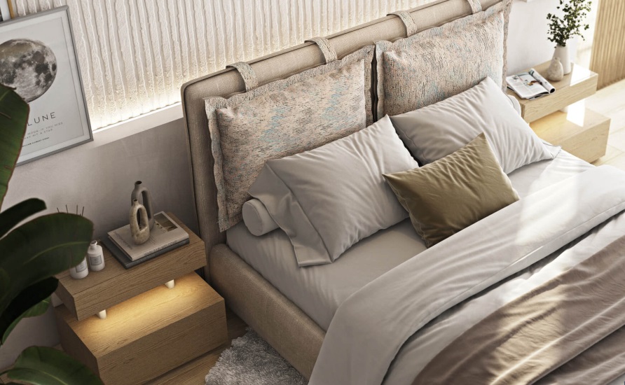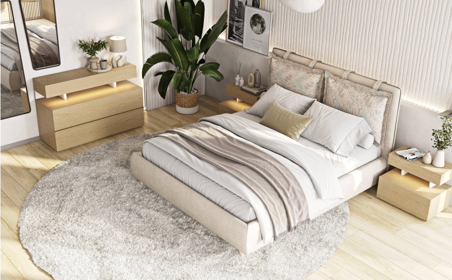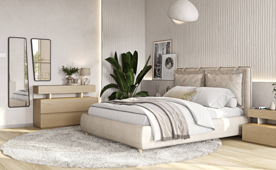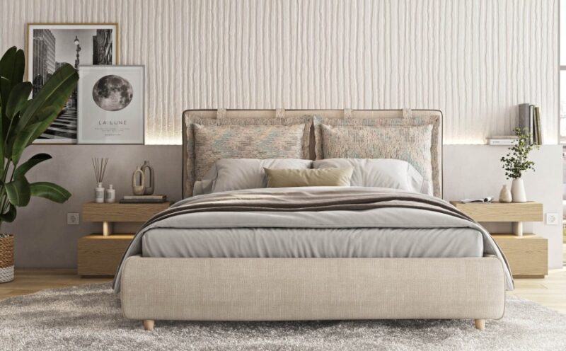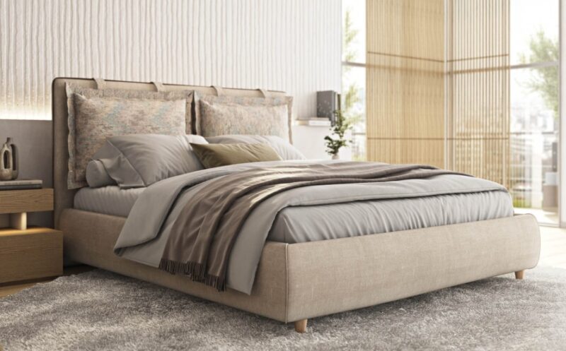 Κρεβάτι με πόδια στήριξης από μασίφ ξύλο οξιάς και υφασμάτινα μέρη που βγαίνουν και πλένονται. Δυνατότητα επιλογής υφάσματος ή δερματίνης. Μπορείτε να επιλέξετε αν τα πόδια θα είναι από μασίφ ξύλο οξιάς ή μεταλλική ενιαία βάση, ανάλογα με το στυλ του υπνοδωματίου σας. Υπάρχει η δυνατότητα προσθήκης φωτισμού LED στο ποδαρικό όπως και μηχανισμός ανύψωσης για επιπλέον αποθηκευτικό χώρο. Επίσης, τοποθετούνται ειδικά λάστιχα στις τραβέρσες που συμβάλλουν στην αποφυγή τόσο των τριγμών, όσο και της σκόνης.